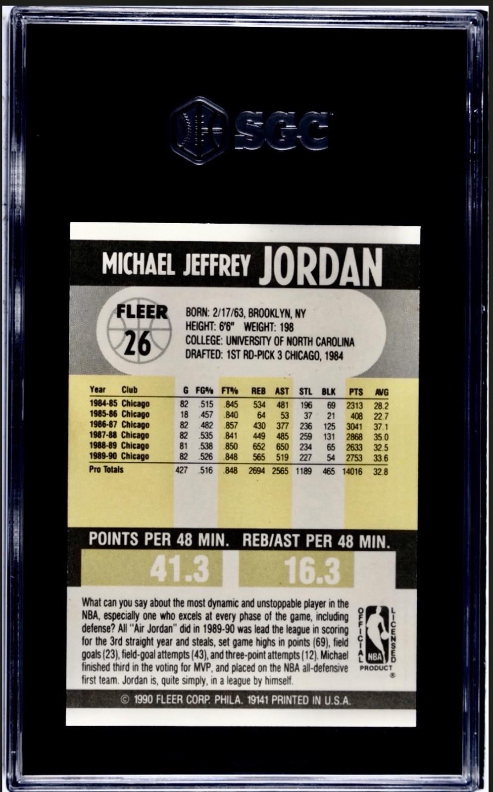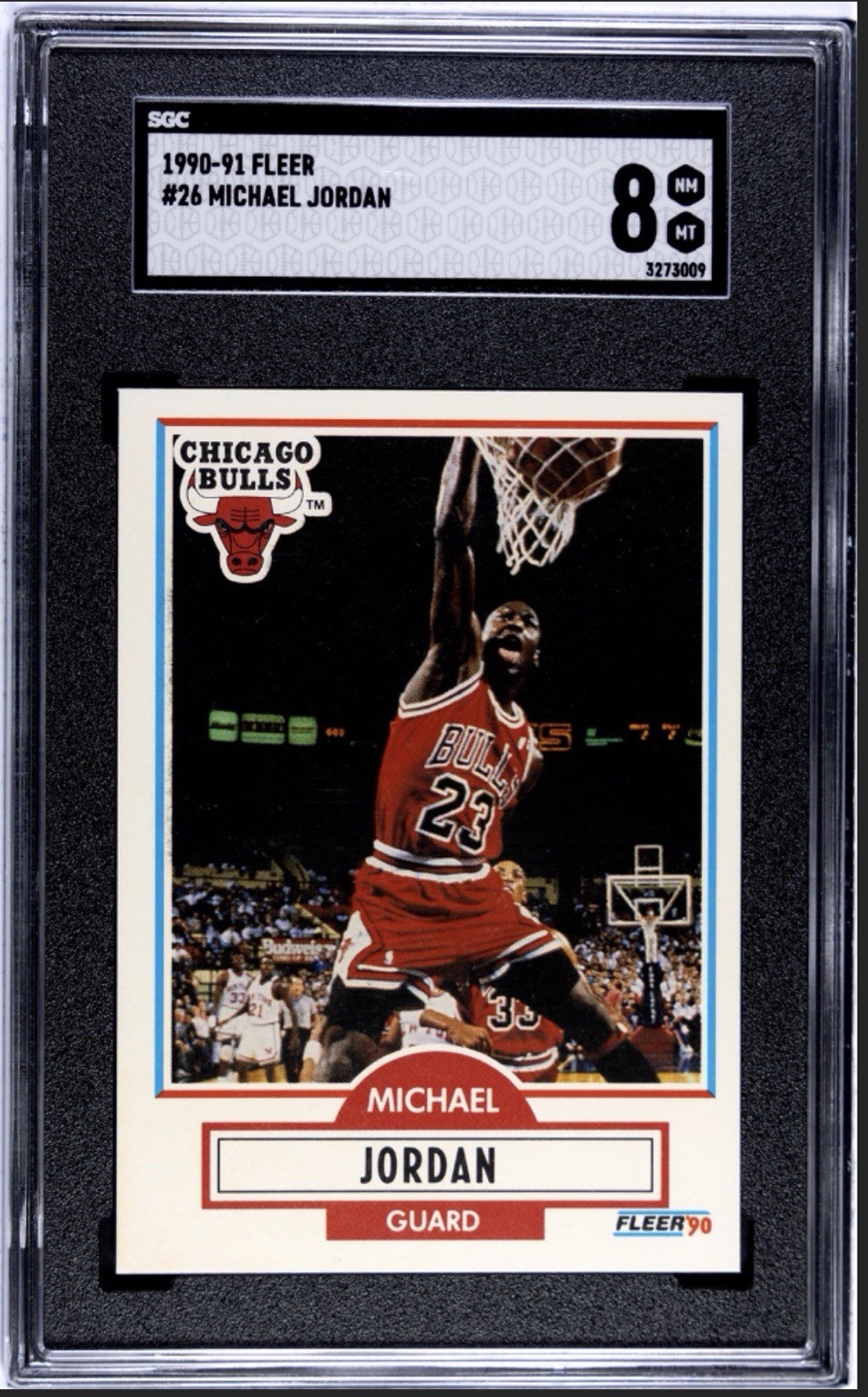 The product is a lot of four high grade Michael Jordan trading cards, all SGC graded and from 1990 -2007.These vintage basketball cards feature the legendary player from the Chicago Bulls in the NBA. The cards are original and come from 1990-91 season #26 grade 8 ,1994 UD Rare Air #66 and #61 both graded mint 9 and 2007 UD Finals F-MJ1 graded 8.5 making them a valuable collector's item for fans of Michael Jordan and basketball trading cards. The cards are in English and manufactured by Fleer, making them a sought-after piece for sports memorabilia enthusiasts.$5.00 shipping domestic