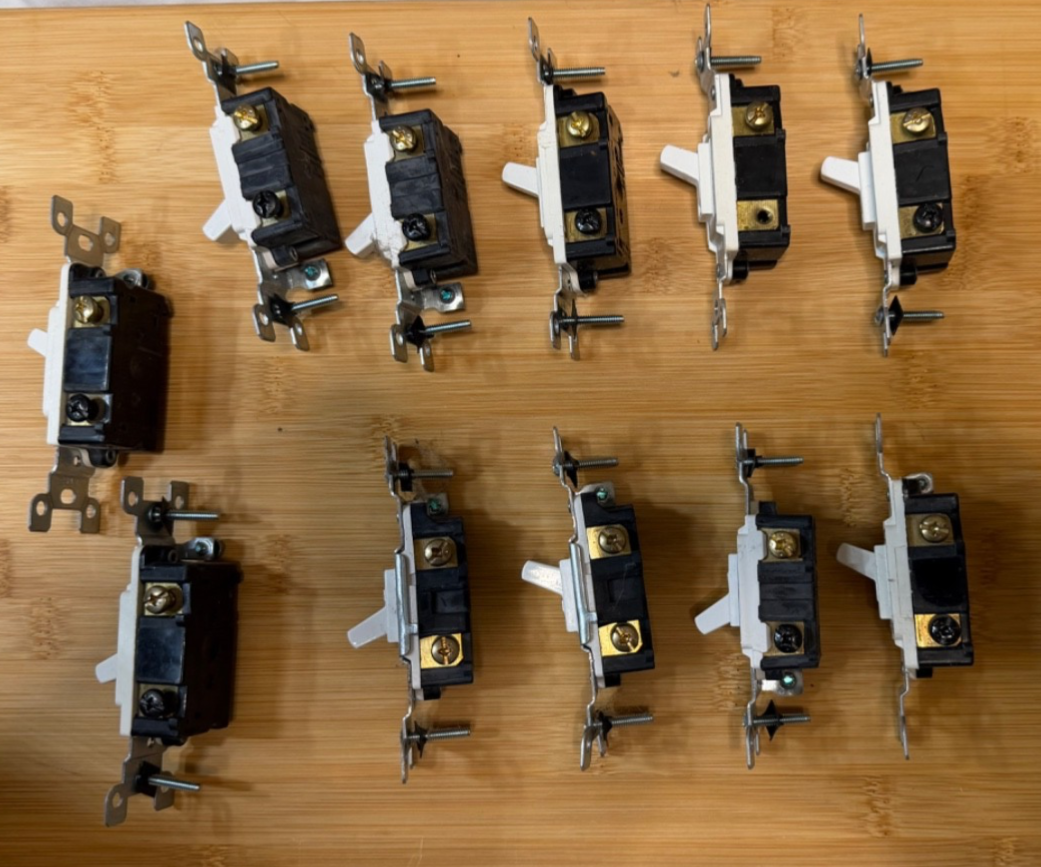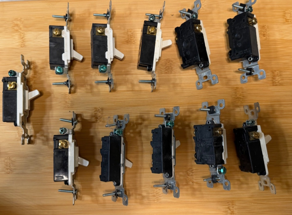 Lot of 11 Single Pole Light Switches + 7 Toggle Wall Plates White Ivory/Cream Mixed Condition: Used / new old stock mixed lot. Switches appear to be previously installed/handled. Wall plates are sealed in packaging. Sold as one mixed lot exactly as shown. Description: For sale is a mixed electrical lot that includes 11 single pole toggle light switches and 7 toggle wall plate covers. This is a good bulk lot for replacement parts, maintenance stock, rental/property projects, or garage/shop use. Included in this lot: 11 single pole light switches 4 cream/ivory single toggle wall plates 1 white single toggle wall plate 1 white dual toggle wall plate 1 cream/ivory triple toggle wall plate Details: Standard toggle style switches Mixed brands/styles White switches Wall plates include both white and cream/ivory colors Plates appear to be sealed/new old stock Switches show light signs of handling/previous installation/storage What’s Included: Only the exact items shown in the photos. Notes: Sold as a mixed lot Buyer should confirm specifications and compatibility for their application before purchase Because this is a mixed lot, individual part numbers/ratings may vary Shipping: Ships carefully packed with tracking.