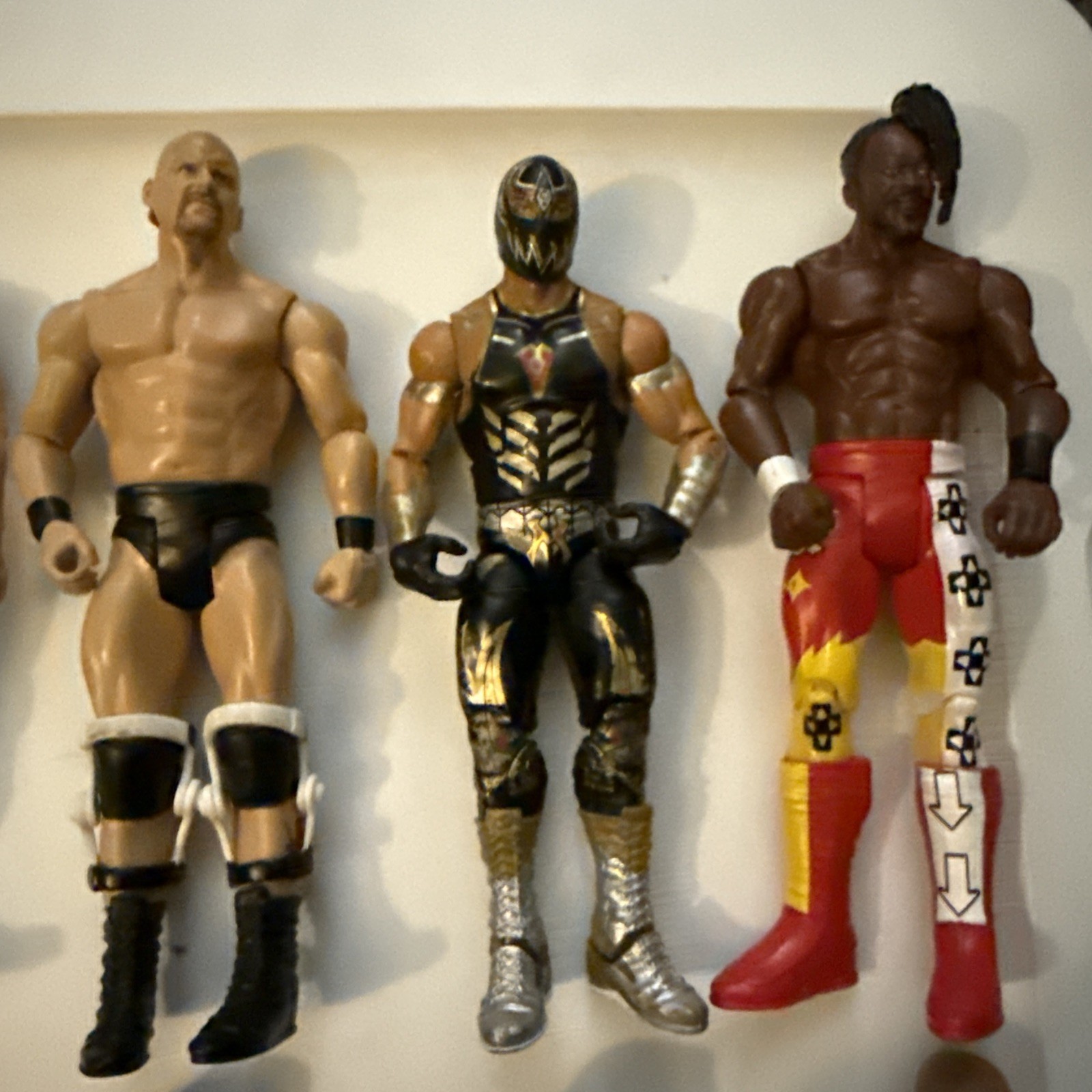 Includes lot of 14 various WWE characters Some have loose joints, some are stiff All gently used with minor wear!