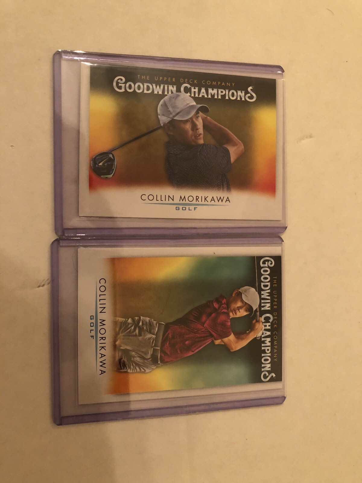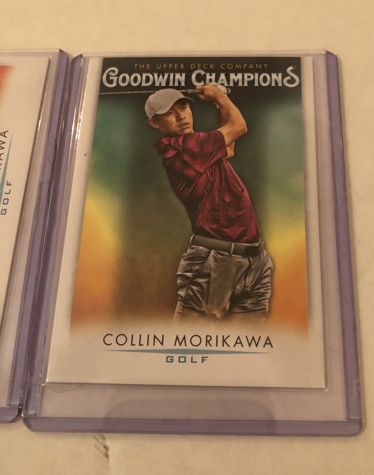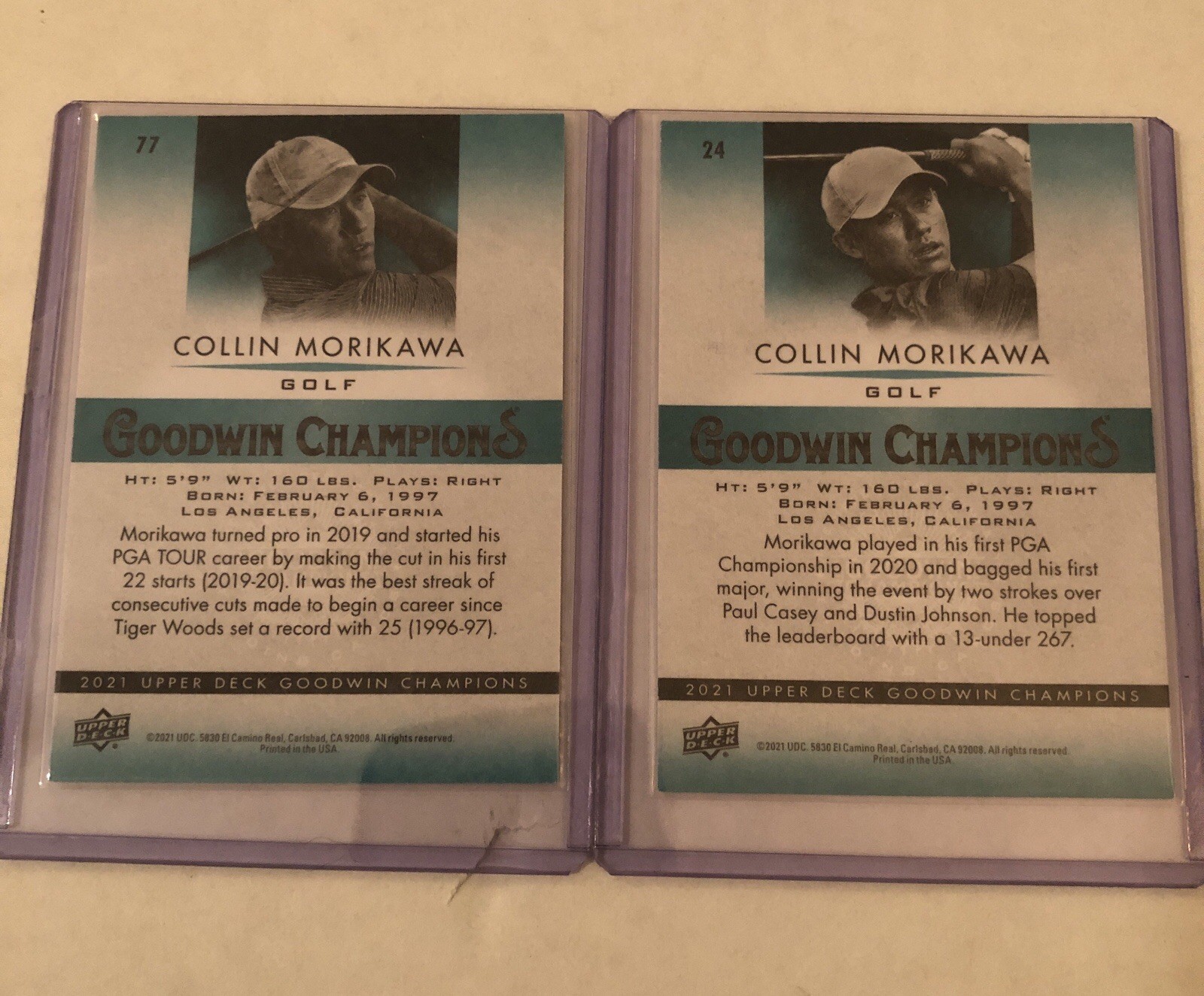 The product is a lot of 2 golf cards from the 2023 Upper Deck Goodwin Champions set. These sports trading cards are original, not vintage, and manufactured by Upper Deck. As a collector's item, this lot may appeal to fans of golf and trading card enthusiasts looking to add to their collection. The cards likely showcase in action in the sport of golf, making them a desirable piece for fans of the PGA tour.