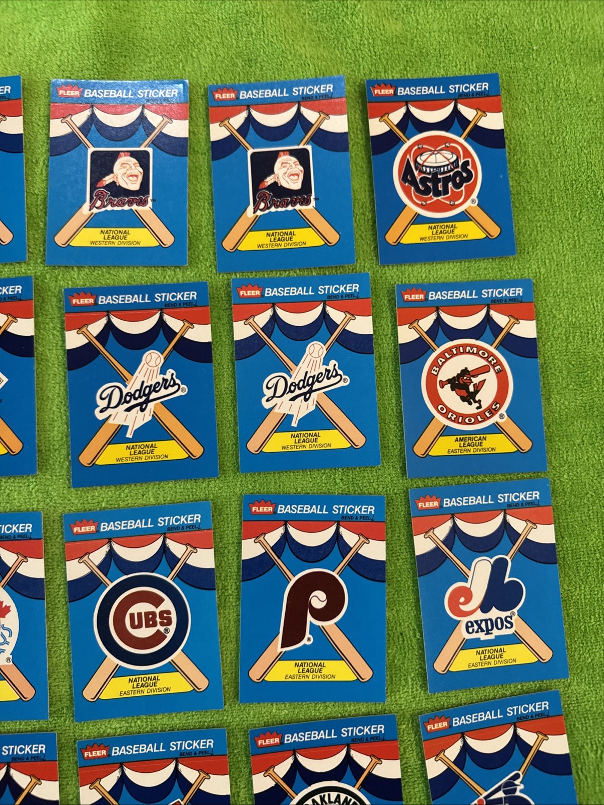 The product is a lot of 24 MLB 1989 Fleer Baseball Team Stickers, with duplicates included. These standard-sized trading cards are from the Major League Baseball (MLB) and were manufactured by Fleer in 1989. The stickers feature baseball teams from the 1988 season and are made of card stock. This vintage collection offers a nostalgic look at baseball teams from the past, making it a desirable addition to any sports trading card collection.