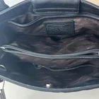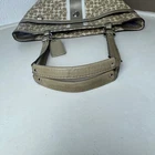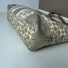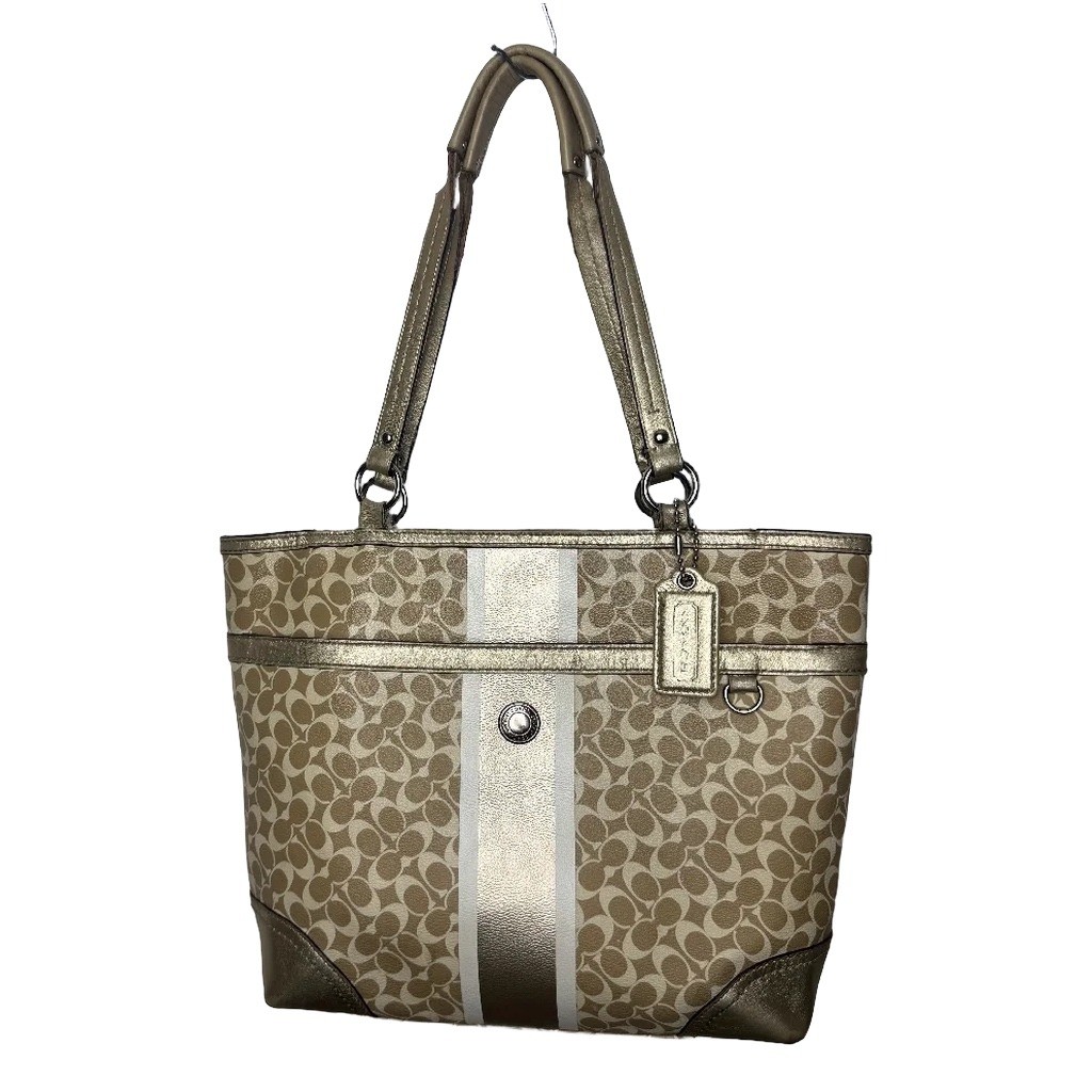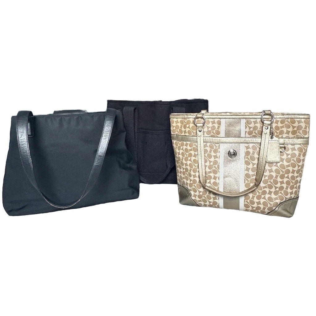 Lot of three authentic Coach bags featuring a variety of styles and materials. Included is a gold signature monogram canvas tote with metallic trim and a striped center detail, a classic black nylon shoulder bag with leather straps, and a black canvas Coach Fragrance promotional tote with webbed handles. This set offers a range of sizes from everyday carryalls to a lightweight shopper, perfect for those who appreciate the brand's timeless aesthetic and functional designs.