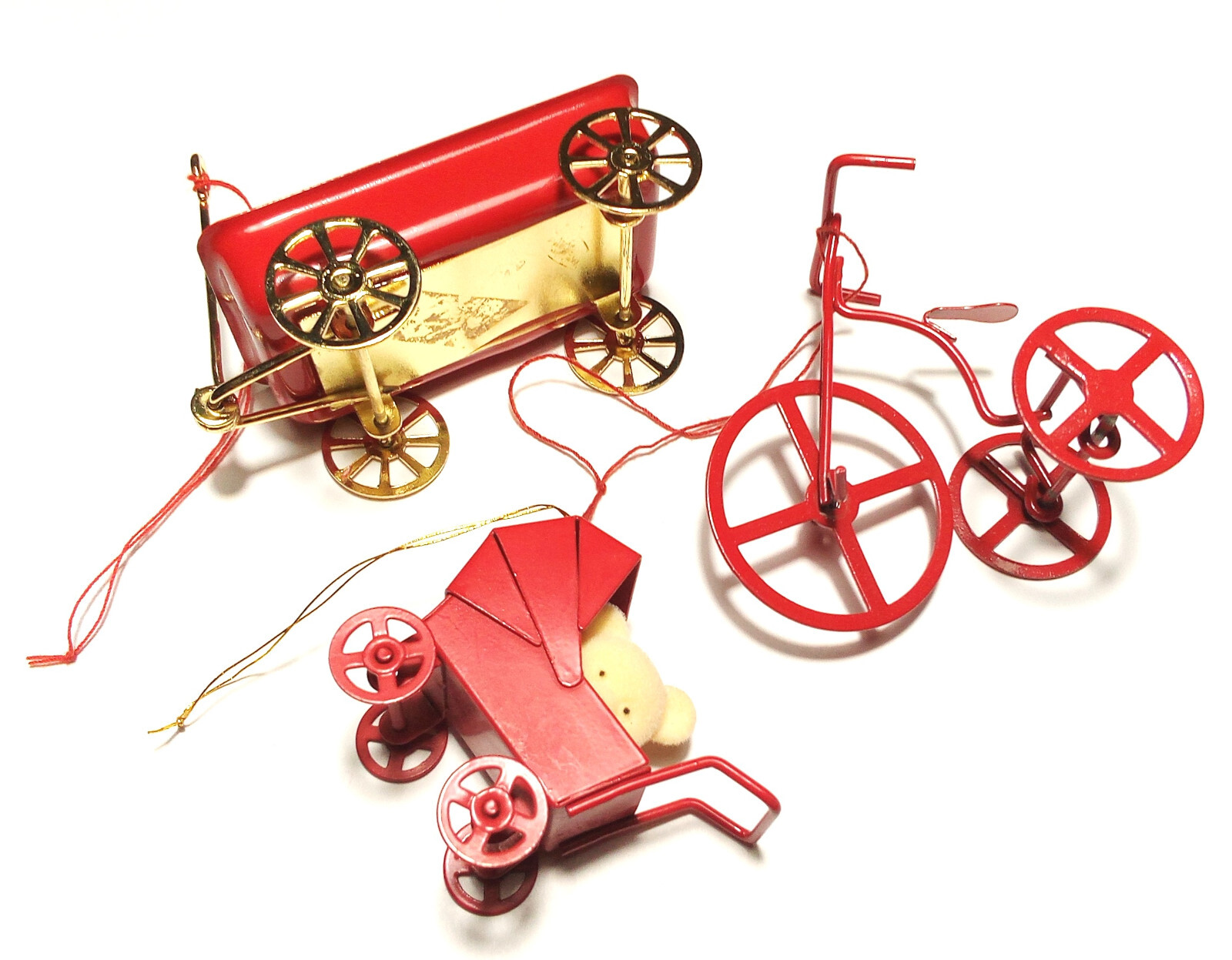 Lot of 3 Vintage Christmas Ornaments Featuring Wagon, Bicycle, and Teddy Bear Stroller