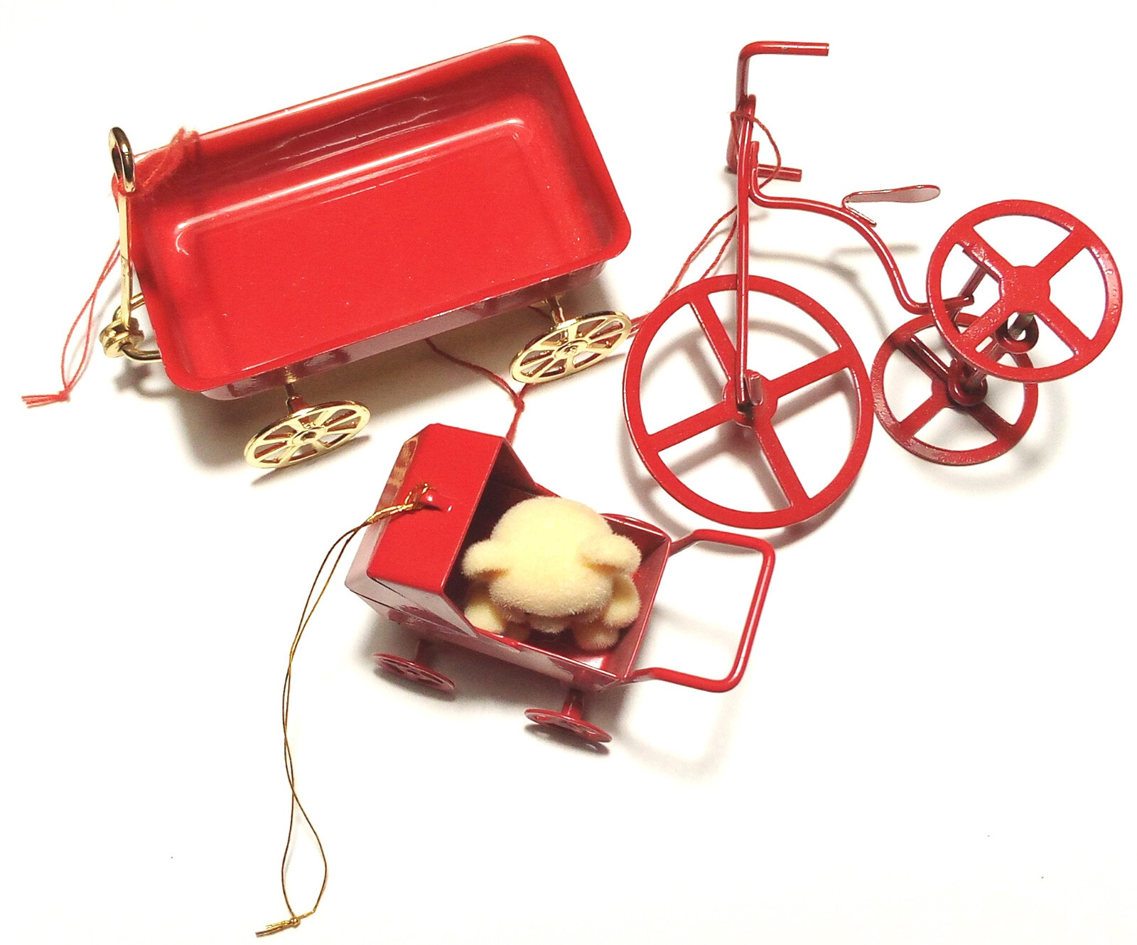 HomeLot of 3 Vintage Christmas Ornaments Featuring Wagon, Bicycle, and Teddy Bear Stroller