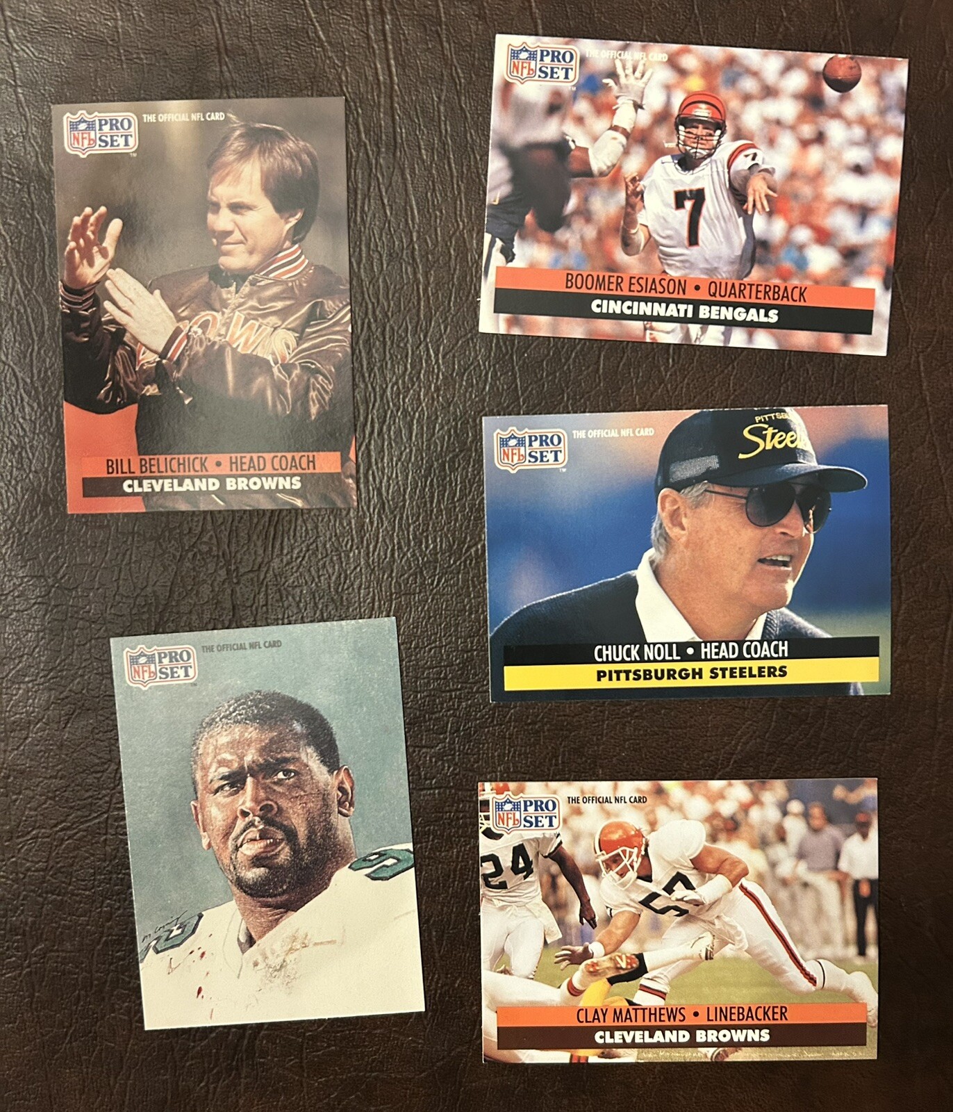 This lot of sports trading cards features 45 original cards from the NFL Pro Set, as well as NBA and MLB cards. The cards are made of card stock material and come with a signed David Nelson card. The set includes cards of famous players such as Ozzie Smith, Randall Cunningham, and Reggie White, as well as coaches like Bill Belichick and Mike Ditka. The cards are in standard size and are perfect for collectors of vintage football memorabilia. The set is a great addition to any sports trading card collection and is a must-have for fans of the Cincinnati Bengals, Houston Oilers, and San Francisco 49ers.