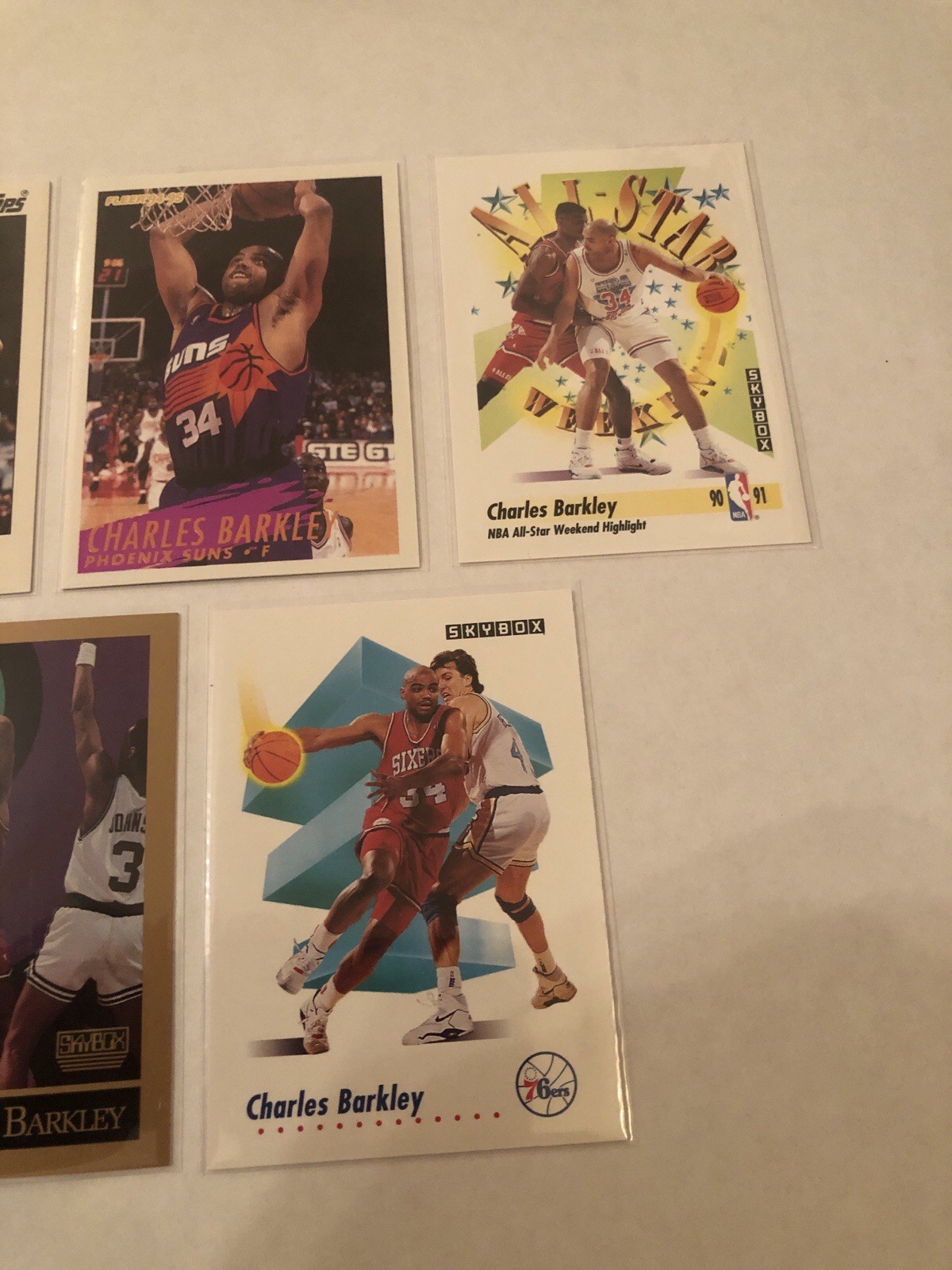 This lot of 5 Charles Barkley basketball NBA cards features standard size trading cards made of card stock. The original cards, part of the base set by SkyBox and other sets, showcase the legendary player from the Philadelphia 76ers in the National Basketball Association (NBA). These English-language cards are a must-have for fans of basketball and collectors of sports trading cards, especially those interested in NBA Finals events and iconic athletes like Charles Barkley. Cards are in excellent condition!