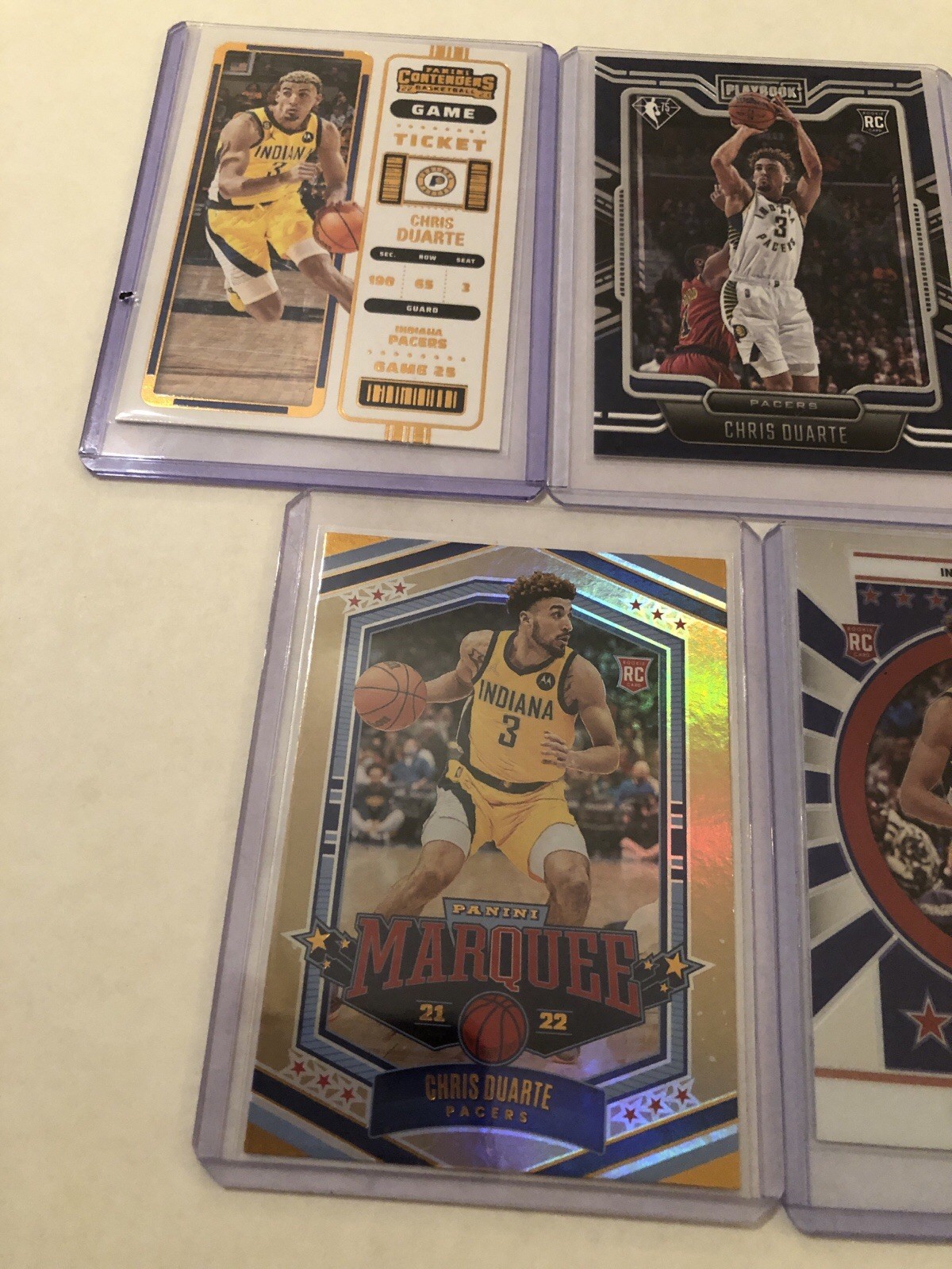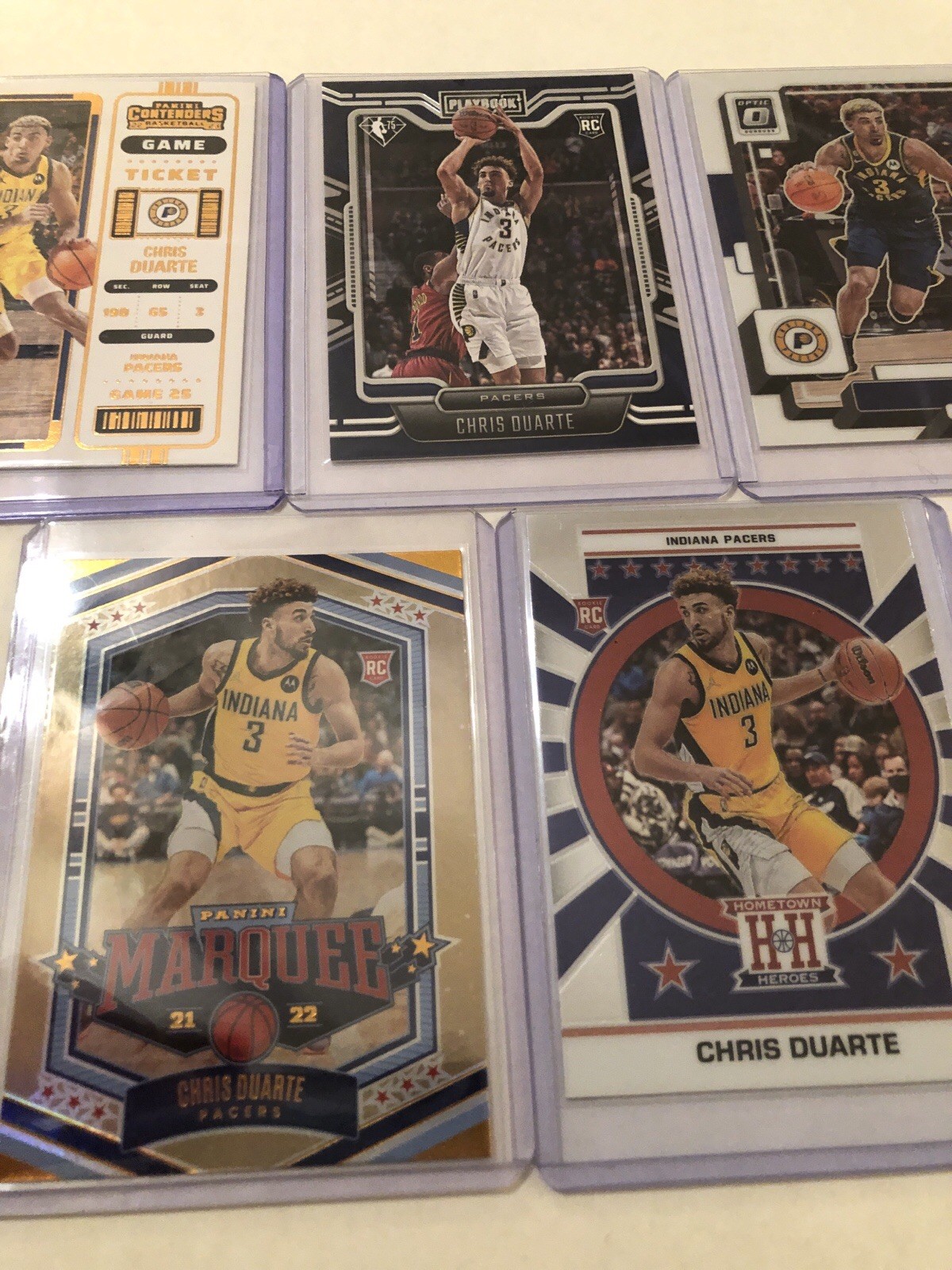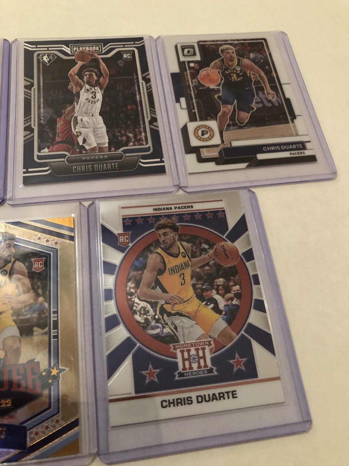 The product is a lot of 5 Chris Duarte basketball NBA cards featuring the Indiana Pacers. These standard-sized trading cards are made of card stock and are original, not autographed. The cards are from the 2020-21 season and are part of a rookie set.