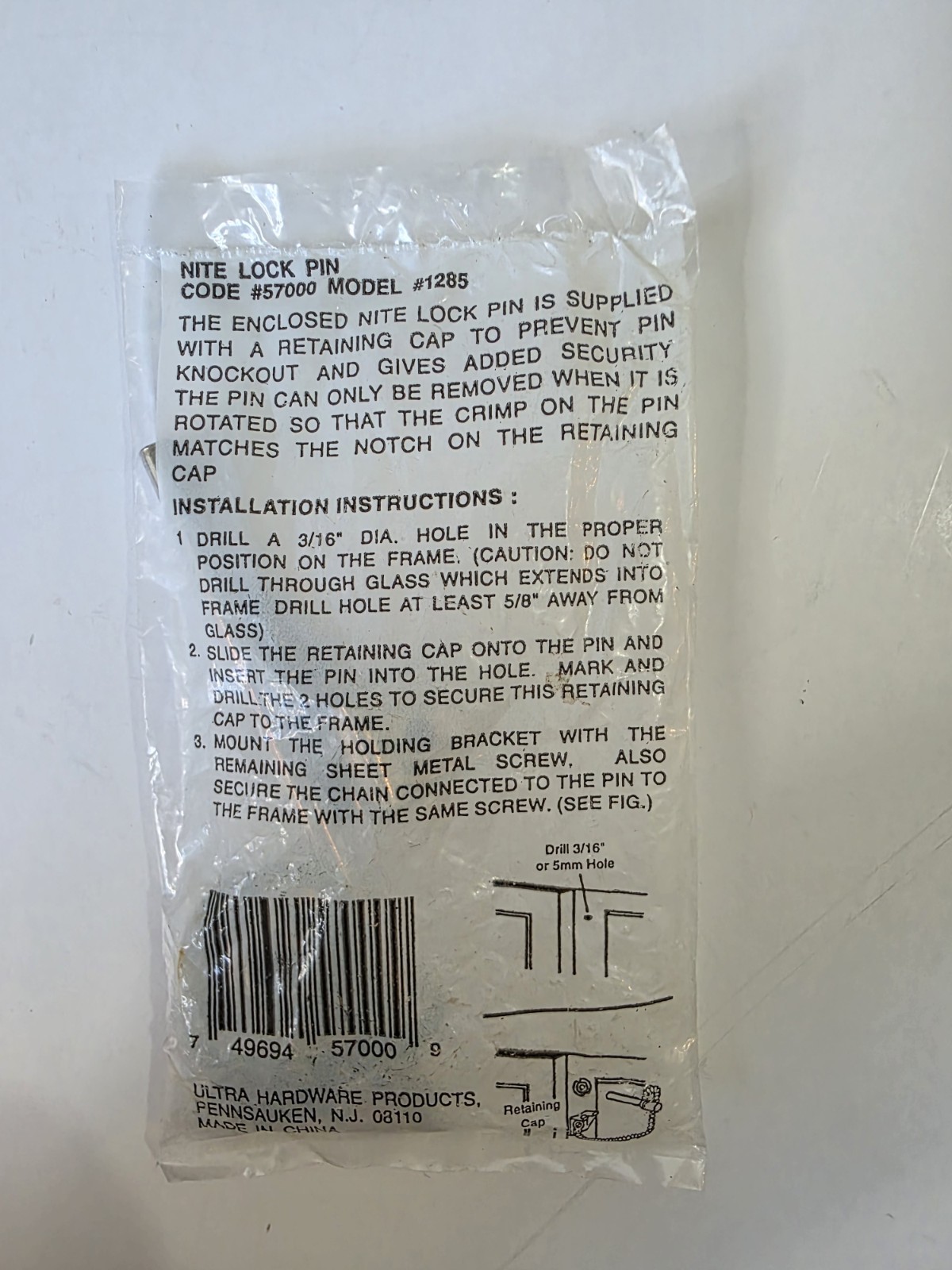 Lot of 5 brand new, sealed Nite Lock Pin Kits – Ultra Hardware Model #1285 / Code #57000. Each kit includes everything needed to install a secure locking pin for doors or windows. Includes: pin, chain, retaining cap, bracket, and screws Material: Nickel-plated steel – durable and corrosion-resistant Condition: Each kit is individually sealed Instructions: Installation directions printed on the packaging Brand: Ultra Hardware Products, Pennsauken, NJ These are ideal for adding security to front entrance doors, storm doors, or windows. Easy to install with a 3/16" drill hole. Great for home improvement projects, landlords, or contractors.