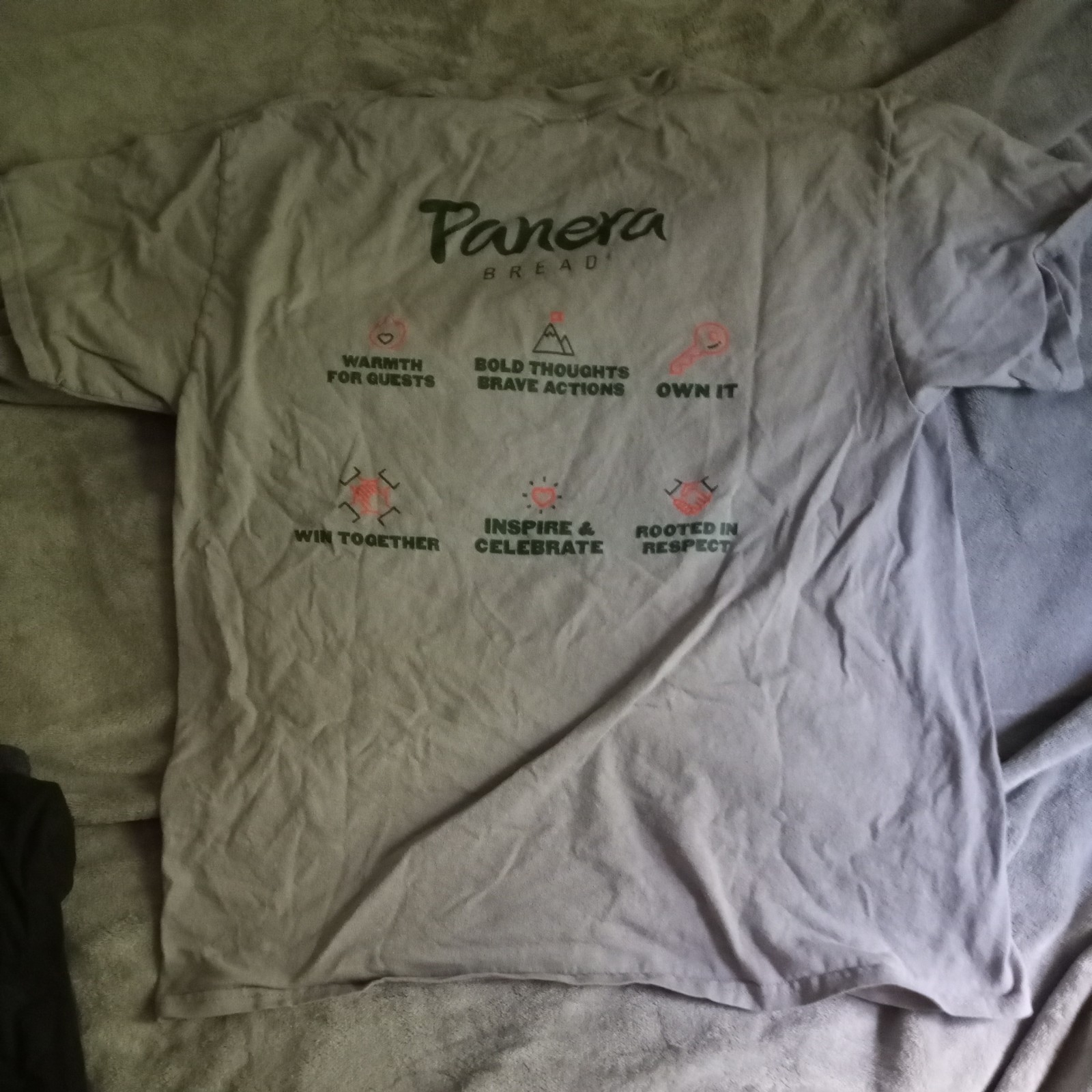 This listing includes 5 authentic Panera Bread uniform tees in size Large. Perfect for Panera employees who need backup work shirts, or for collectors of restaurant and café apparel.Details:Quantity: 5 shirts (all included in this lot)Size: Large (men’s/unisex fit)Color: Black with Panera Bread logo on frontCondition: Gently used, well cared for, lots of life leftStyle: Short sleeve crewneck uniform work tee✅ Great if you work at Panera and need extras for your shifts, or if you’re into branded fast-food and café collectibles.📦 Fast shipping, packaged with care.