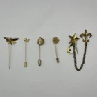 Lot of 4 vintage gold tone hat pins and 1 vintage gold tone fleur-de-lis star brooch/lapel pin. Hat pin designs include spiral, bow, ornate flower, and butterfly. 1 hat pin and the brooch pin are missing their caps, but the other caps provided fit these pins.