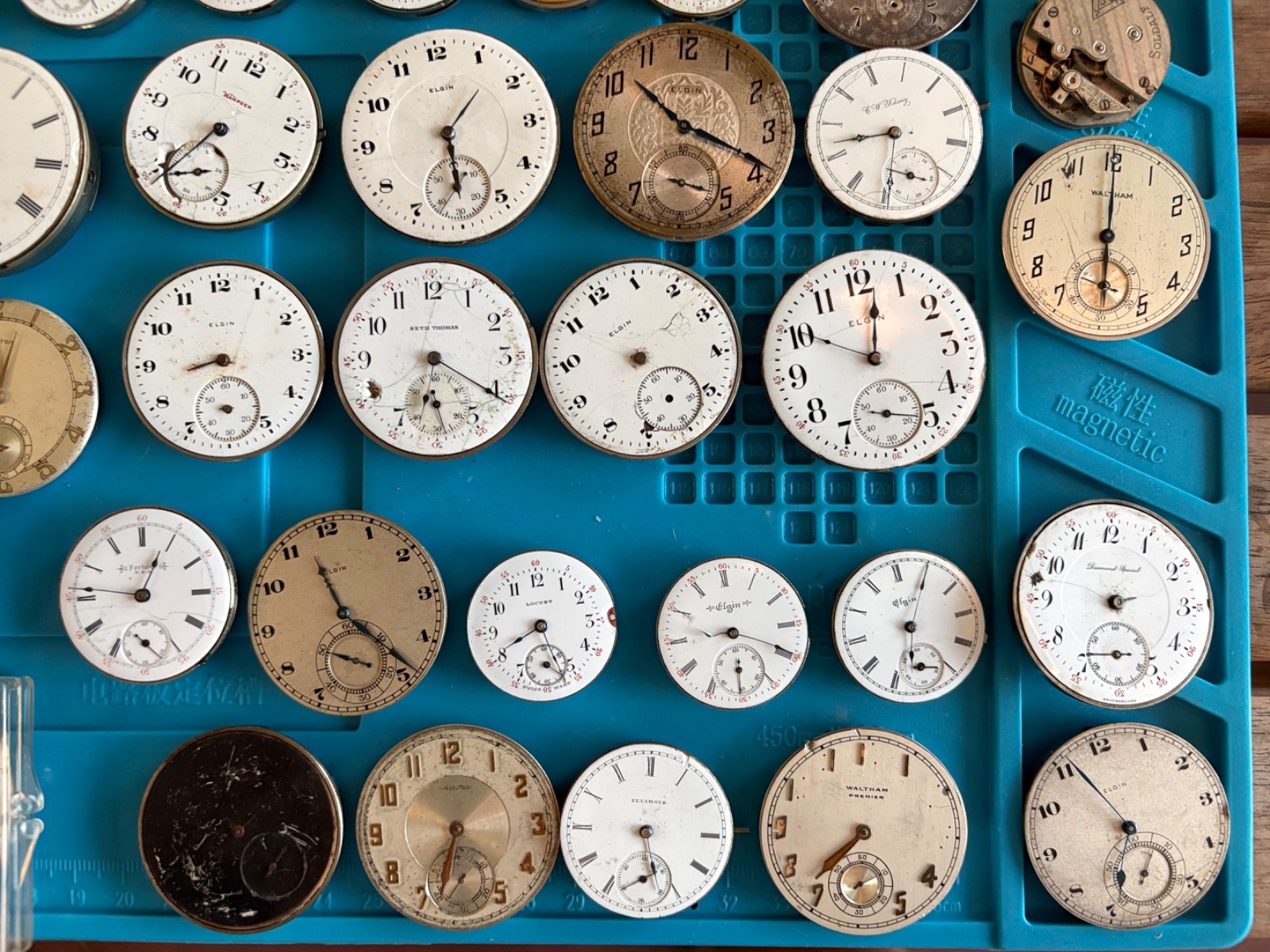 Large lot of 51 antique mechanical pocket watches, total weight of everything included is 5 pounds 15 ounces. The majority of these are complete with the exception of missing hands. I went through these and most have an issue at the balance wheel but it appears the escapement is working correctly on most. Meaning you can engage the escapement wheel and make them “tick” however they will still need work on the balance wheel. There are 11 that wind up and run fine. Also included are some extra dials and 12 dissasembled movements and two antique pocket watch movements. There are a couple lower end Ingersoll watches in the top row that are more parts but one is in a case. There are a couple cases that are complete maybe needing a new crystal, couple need backs. The cases are silveroide or nickel. Brands Included: Illinois Watch Company, Elgin, Waltham, LaSalle, Hamden, G.W. Davey, Soldale, Seth Thomas, Fortuna, A.W. Co, Herald, Diamond Special (21 Jewel), Locust. Couple dials are Elgin, CYMA, Pain Brothers Hastings “True Briton”, Hampden, Sentinel, Admiral, South Bend. There are no extra crowns and pins included in this listing. A few watches have the stem inside them you can turn and wind up. The cases all have crowns and stems. Item Size: Varying Item Condition: For parts or repair. I cannot test each component of each of these watches. Although 11 wind up and run, I have not tested time accuracy or monitored for longer than to confirm they wind up and run. Many of these are likely easy fixes and absolutely great for donor parts if that’s what you choose. Items Included: Watch only. Returns Accepted: No, due to nature of age of watch and buyers scalping needed pieces. Please view description and all photos showing condition to make your decision on purchasing. Please note: ALL photos and video are of the actual item listed in this sale or supporting documentation of the item. Shipping: All items are shipped typically within 2 business days. Tracking is provided. All items above $100 in value will have added insurance added and tracking. All luxury/premium watches will have an option to first ship to an authenticator. Returns: I have a select policy on returns for certain items please read this and ask any questions you might have. I do my best to provide an abundance of details of each item including photos, videos in most cases, wrist size for wrist watches, watch case diameters, etc. I am happy to provide additional photos or answer questions before you commit to purchase but please measure your wrist to ensure the proper fit for yourself. Antique items as an example including parts watches that are sold as for parts or not working will not have a return option available. All approved returns need to be completed within 14 days and all items with a value of $100 or more need to have insurance coverage for the original sale price. All items that originally went through authentication must return back through the authenticator prior to return and refund. Item #: 0004
