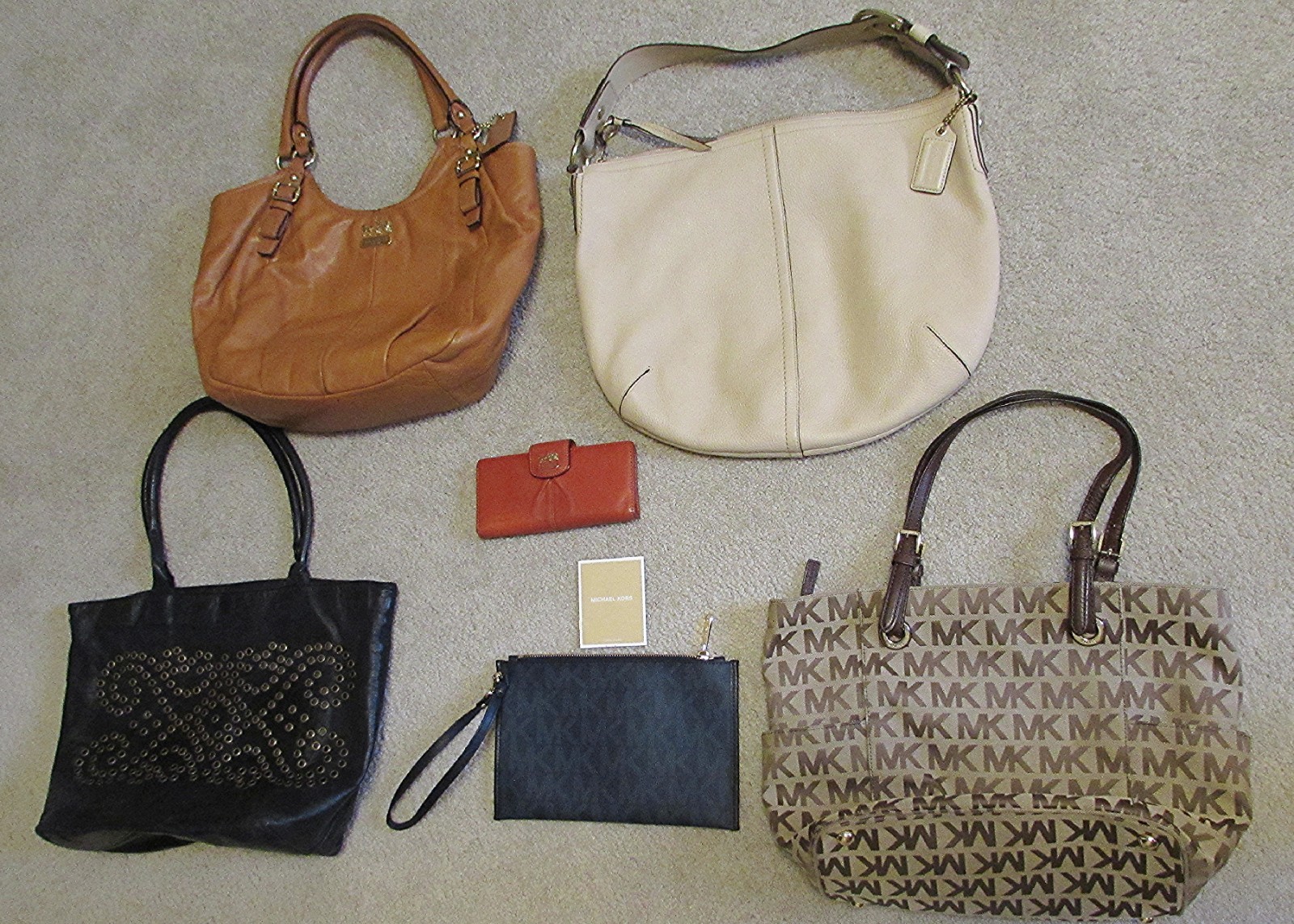 LOT OF 6 ~ DESIGNER PURSES AND WALLET COACH, MICHAEL KORS, BURGE These bags are all in good to excellent condition, with minimal signs of wear. All are being sold as-is, so please be sure to closely examine all photos and descriptions. Included: Tan Michael Kors Signature Jet Set tote bag with zip top, lots of interior pockets, and brown leather trim. Medallion hang tag is missing. EUC. Michael Kors Signature Jet Set travel xl clutch/wristlet in navy blue, with tag. Brand new. Coach 11839, Soho large cream colored pebbled leather hobo shoulder bag w/tag. EUC other than a couple very faint areas of discoloration on leather, inside clean. Top zippered closure with inside pockets. Coach 18612 Madison Abigail leather hobo shoulder bag in tan leather w/hangtag. Clean inside and out, only 2 tiny ink marks on bottom of bag. Zippered top closure, interior pockets, lining clean. Berge black leather large studded tote with inside zip pockets and magnetic snap closure. One of the metal studs on the front is missing and a couple others show some patina, age appropriate. Made in Italy, leather does show some aging but no tears, clean inside with 2 large zippered pockets and snap top closure. Coach Madison red leather slim wallet with zippered coin compartment on the outside back, inside slips for cash and 13 inside credit card/ID pockets. Some blue ink marks on front left bottom, but overall really good condition. PLEASE NOTE : We work hard to ensure that our auctions are high quality and our prices competitive. If you're not happy with your purchase, please let us know right away ~~ before you leave feedback, and we'll work hard to remedy any issue. If you are happy, please be sure to leave us positive feedback, and we'll quickly reciprocate. PAYMENTS, SHIPPING AND RETURNS We accept payment via Paypal. Payment must be received within 2 days of auction's end, with immediate payment required for items purchased using the BUY IT NOW option. We reserve the right to relist the item if we don’t receive your payment within 2 days of auction's end. Items ship within 1 business day of the date your payment clears, but we don't ship on holidays and weekends. We ship to the US (excludes PO Boxes, or APO/FPOs), and can only ship to PayPal verified addresses. All sales are final, and we can only accept returns and issue refunds if the item arrives damaged or isn’t as we've described. Please be sure to ask any questions you may have before bidding. Thanks so much for stopping by, and please be sure to check out our other items! All of our items come from a smoke-free, pet-free environment.