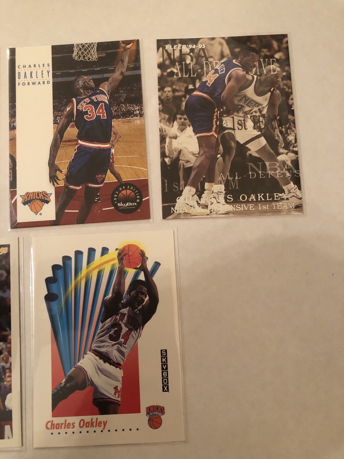 This product is a lot of 7 Charles Oakley New York Knicks basketball NBA cards. These sports trading cards likely feature the player's image, stats, and other related information. Perfect for fans or collectors looking to add some memorabilia of this basketball legend to their collection. Cards are in excellent condition!