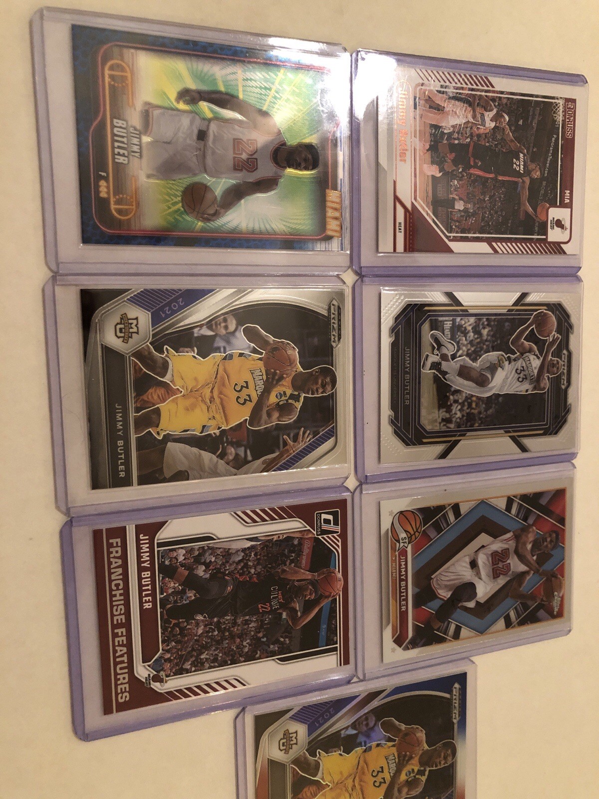 The product is a lot of 7 Jimmy Butler basketball NBA cards featuring the player from the Miami Heat and Marquette. These standard-sized trading cards are made of card stock and are original prints from the manufacturer Panini. The cards are from the 2020-21 season and are part of the National Basketball Association (NBA) league.