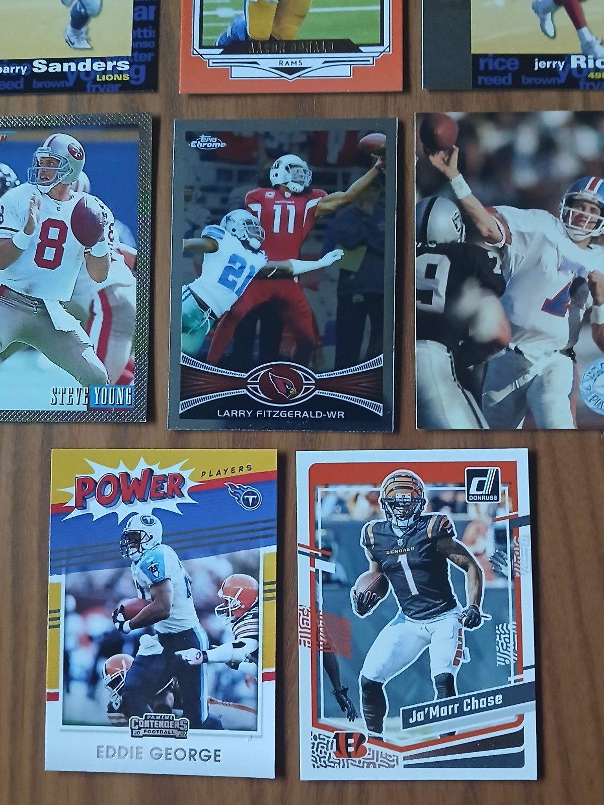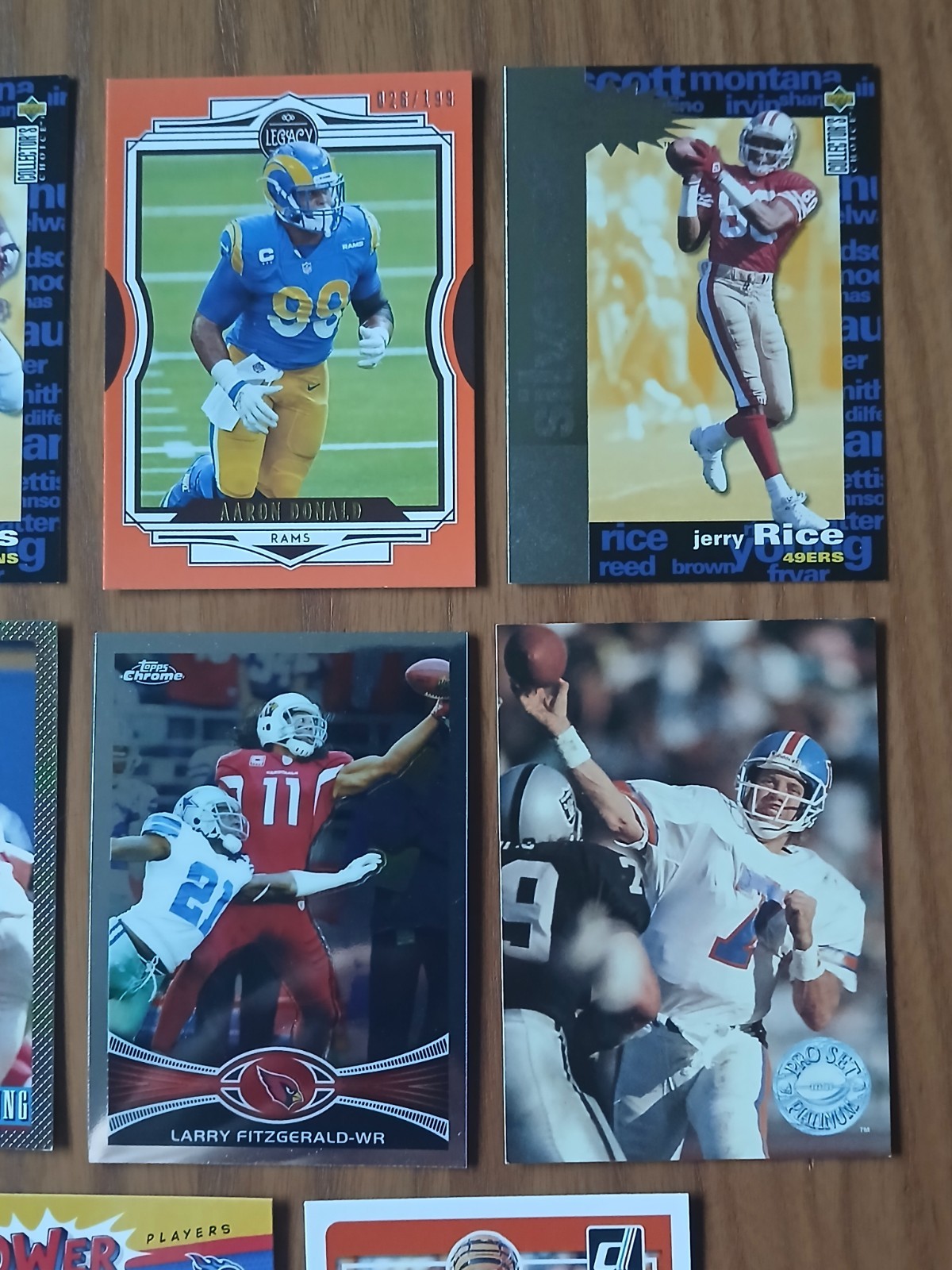 This product is a lot of 8 NFL trading cards with inserts featuring players such as Jerry Rice, Barry Sanders, and John Elway. Each card is made of card stock and is an original, not a reprint. The cards are all standard size and belong to the National Football League (NFL) league. They are not autographed and include features such as being serial numbered, a short print, and a rookie insert. The cards are in English and manufactured in the United States. Perfect for football card collectors looking to add some legendary players to their collection.