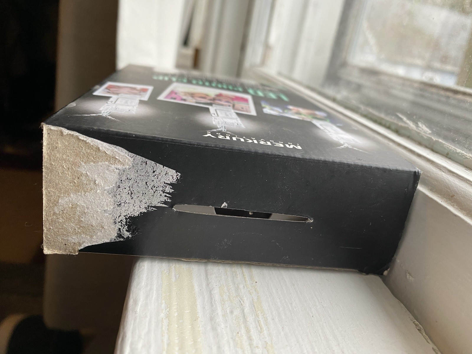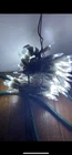 These new (open box), warm white LED string lights are 15 ft in length and there are 16 light clips , 8 inches apart. They have 120 hours of battery life (requires 3 AA). Please note, there is damage to the top of the box (photos). Christmas lights were tested. They are NOT warm white, they are cool white and very bright. Have white wire, a voltage of 120 V and there are 100 bulbs, does not come in original box.