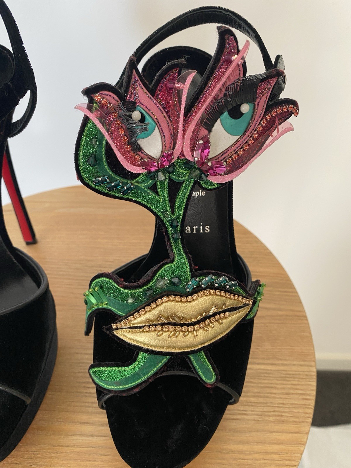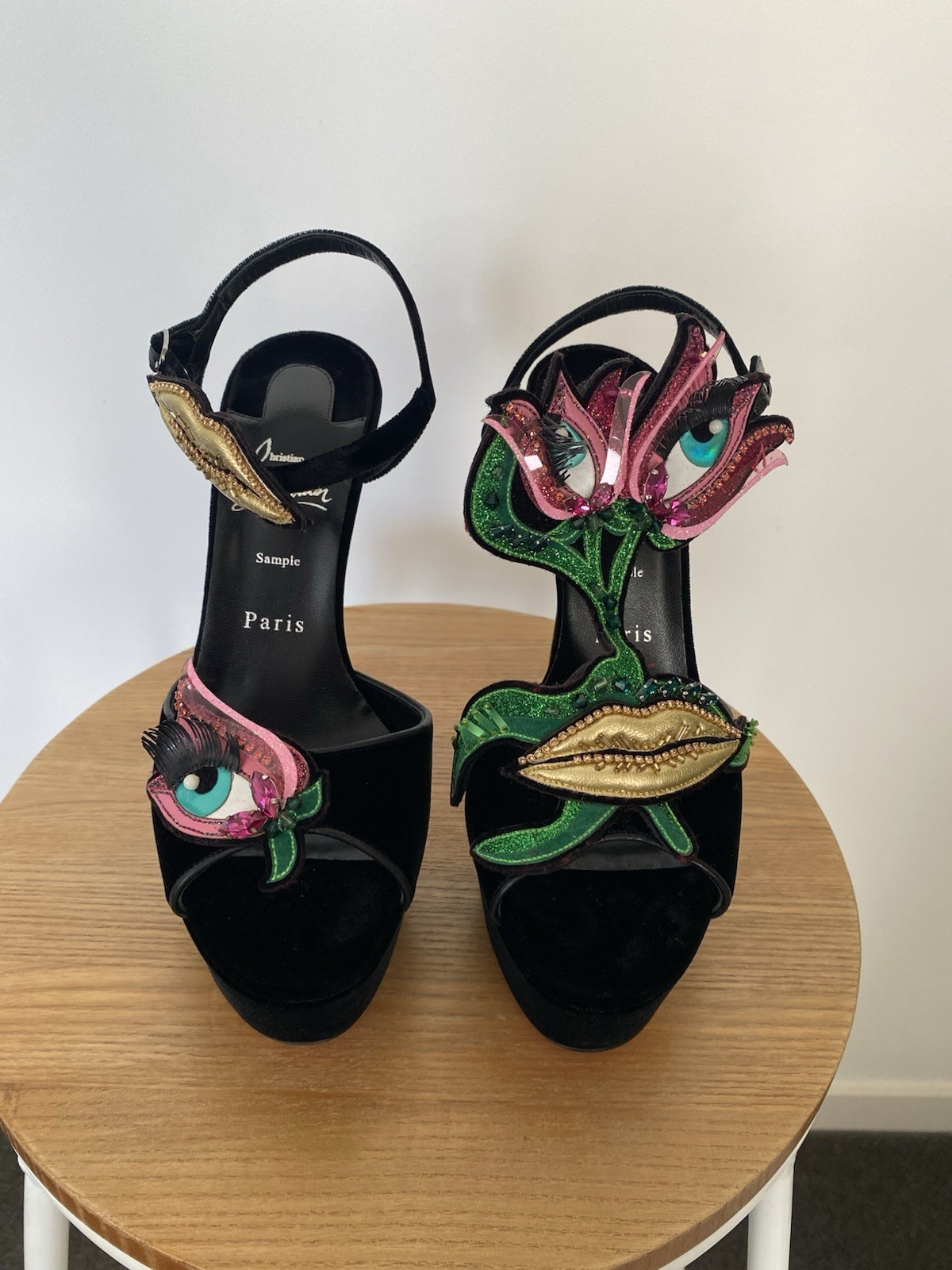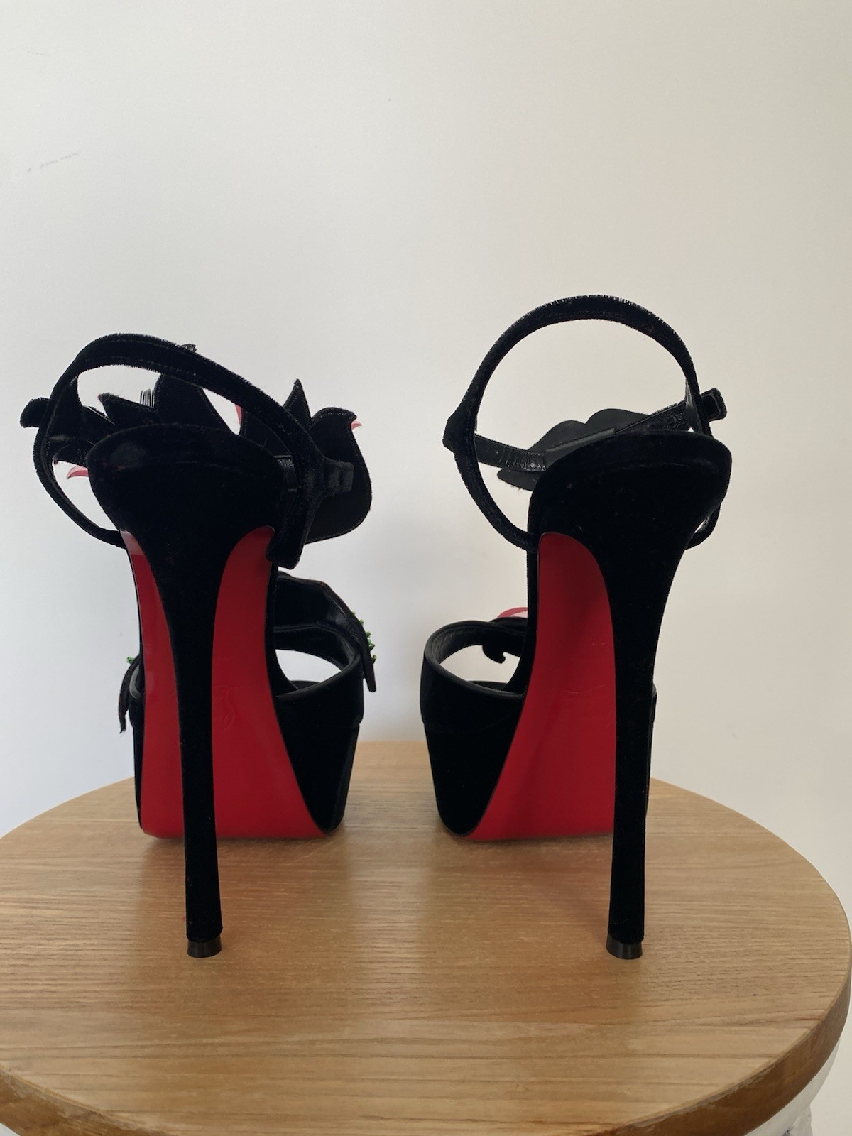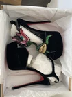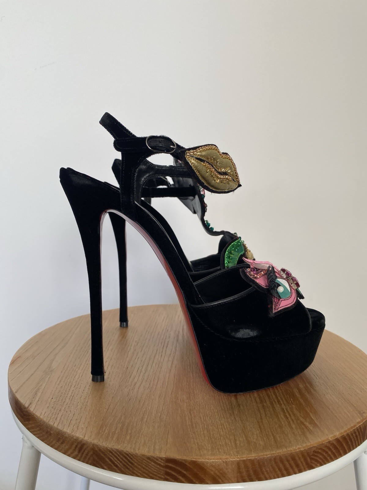 Christian Louboutin platform sandal in great condition. Worn once & few scratches on the sole. Some spot on the velvet has been flattened due to position of the shoes in the box. Size 39. Features great and fun embellishments. Very rare and fun Christian Louboutin piece Comes with a box and 2 dust bags Due to tariffs regulations, I do not ship to the US