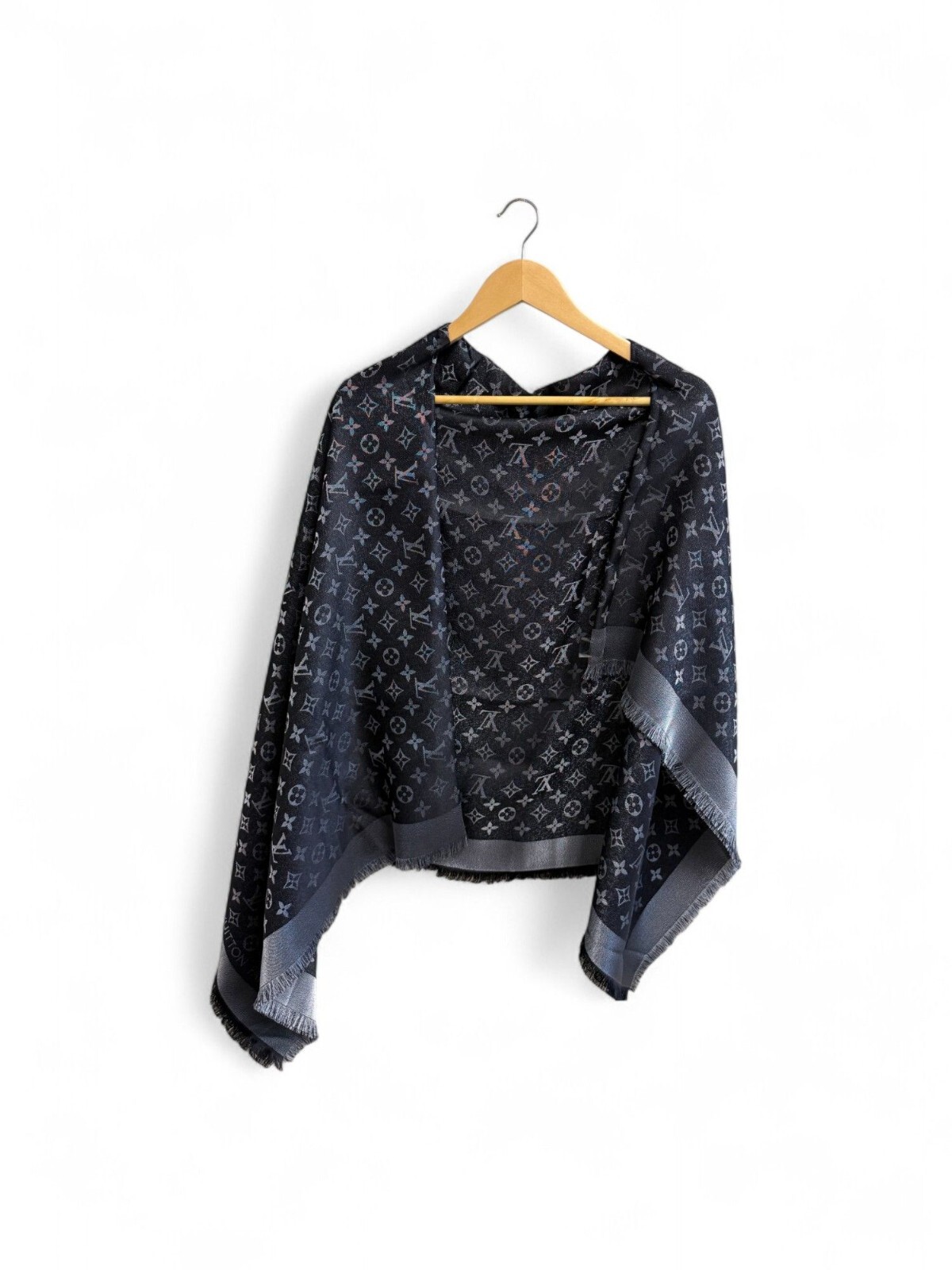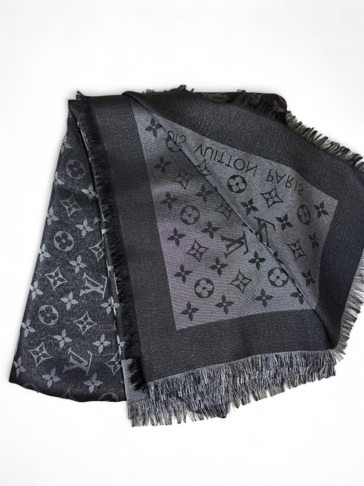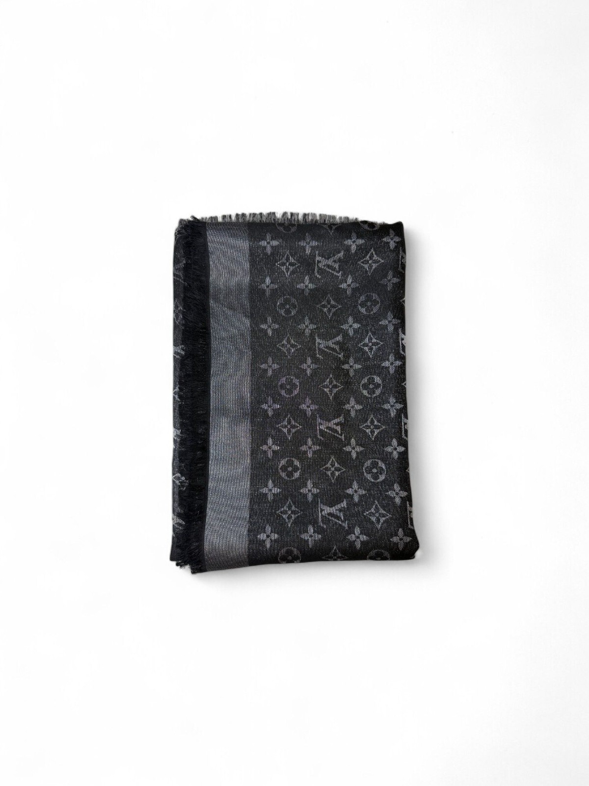 This luxurious unisex shawl from Louis Vuitton’s Monogram Shine collection is crafted from a sumptuous silk-blend fabric, showcasing dual-sided design. One side features the iconic tonal black-on-black monogram, while the reverse highlights bold LV initials and “LOUIS VUITTON” text for a more graphic, modern edge. The oversized square silhouette (approx. 140×140cm) is finished with elegant fringed edges that add movement and texture. Lightweight yet insulating, it’s perfect for transitional weather or air-conditioned evenings. Style it as a scarf, head wrap, or draped over the shoulders for instant elegance. Whether paired with a tailored coat, layered over a slip dress, or knotted with a crisp white shirt, this shawl elevates any look with quiet luxury. The reversible design and monochrome palette make it endlessly versatile—an ideal piece for both travel and everyday sophistication.