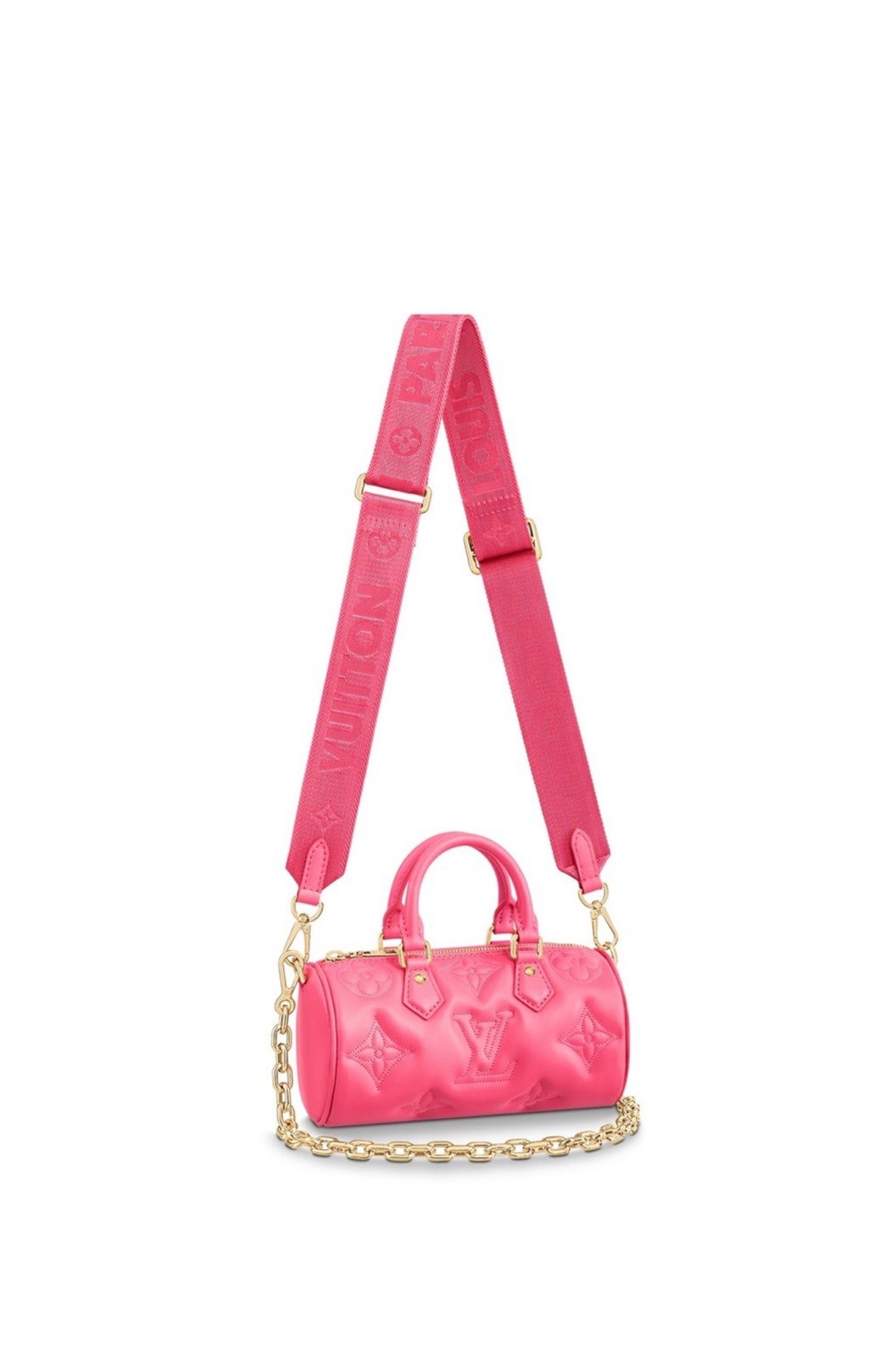 This is the authentic LOUIS VUITTON Calfskin Bubblegram Papillon BB in Dragon Fruit. This limited edition barrel-shaped bag is created of puffy calfskin leather and embroidered Louis Vuitton monogram in pnik. It features rolled leather top handles, an optional adjustable nylon shoulder strap and a gold hardware. The top zipper opens to a pink fabric interior with a pocket. Base length: 7.75 in Height: 4.00 in Width: 4.00 in Drop: 2.75 in Drop: 8.50 in Drop: 16.00 in