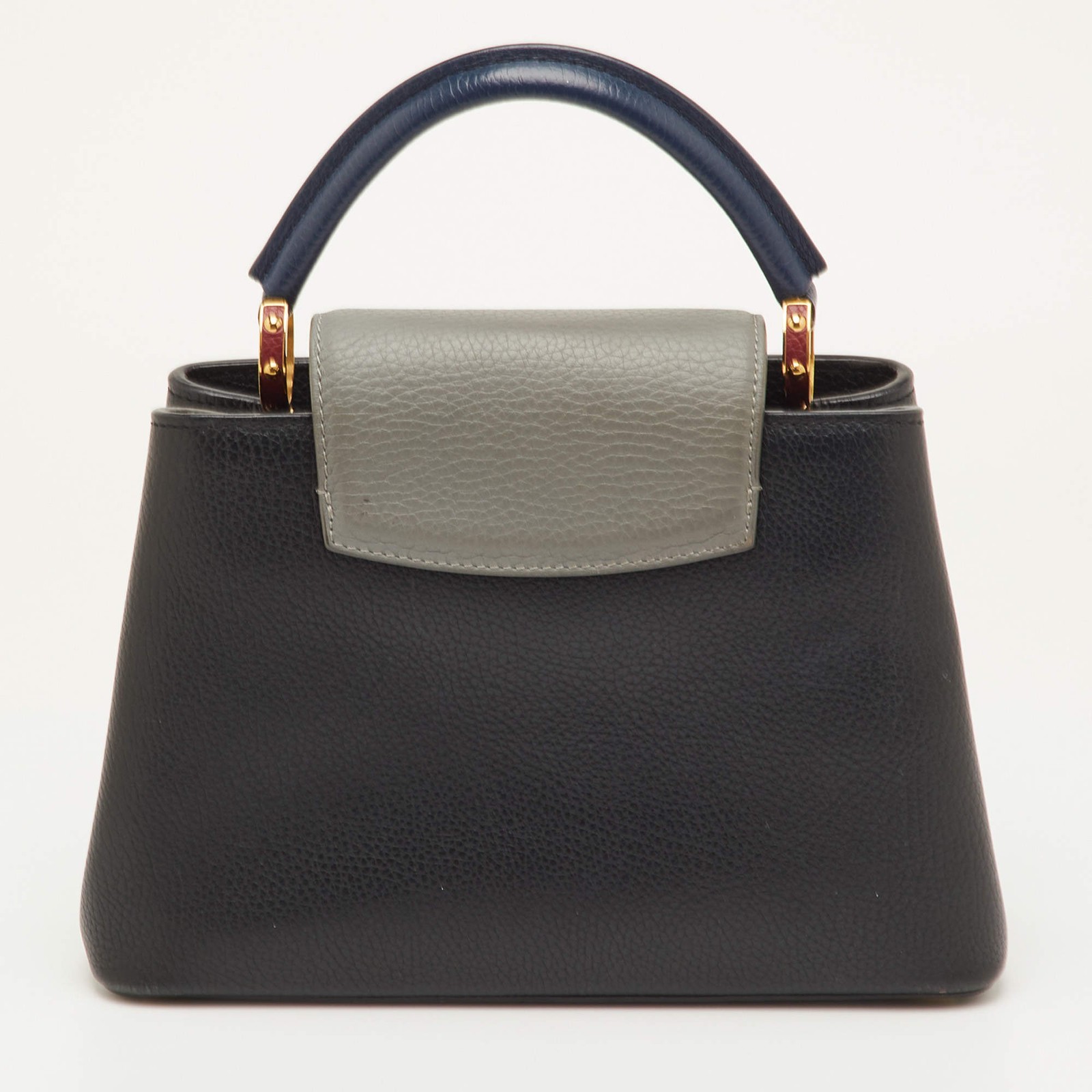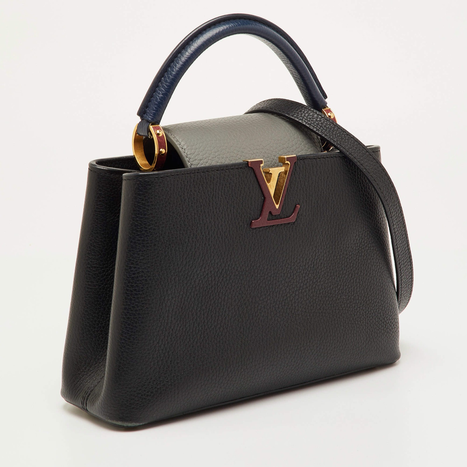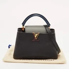Our eBay Store About Us Contact Us Add to Favorite Sellers Louis Vuitton Capucines BB BlackGrey Taurillon Leather Bag This preloved Capucines BB blends black and grey taurillon leather with a navy handle accent. The gold and burgundy LV initials bring a contrast against the muted tones. Inside, the bag opens to a structured compartment with a secure flap closure. A detachable strap adds the option to wear it on the shoulder or crossbody, making it both luxurious and practical. Product Details Brand Louis Vuitton Includes Original Dustbag, Detachable Strap Certified by The Luxury Closet This item has gone through a detailed authentication process overseen by our experts. We offer a lifetime guarantee of authenticity on all our items. How We Check The in-house team of experts at The Luxury Closet is highly trained to verify the authenticity and the condition of the luxury products. They ensure that only 100% authentic items are put on sale.The evaluation process is unique with its own mix of assessment criteria and differs according to the category. Each item is evaluated based on the following combination of hallmarks, hardware, stitching, symmetry, material, craftsmanship, stamping, codes, hologram stickers, and packaging. Our authenticators also check if the items have been modified or amended (e.g., aftermarket diamonds, replaced batteries, repaired bags, etc.) International Buyers Import duties, taxes and charges are not included in the item price. These charges are the buyers responsibility. Please check with your country’s customs office to determine what these additional cost will be prior to buying.