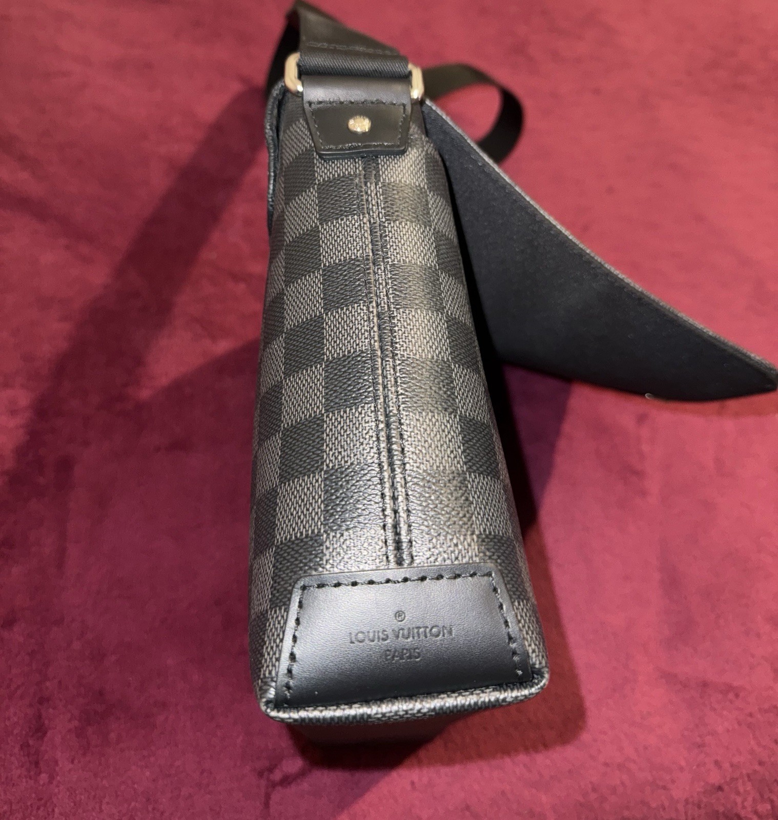 The Louis Vuitton Damier Graphite Messenger Bag in black features a classic checkered pattern on coated canvas with a leather trim. This stylish bag is perfect for travel, casual outings, or business meetings, with a magnetic closure for security. The adjustable shoulder strap provides added convenience, while the silver hardware adds a touch of luxury to this designer piece from Louis Vuitton's Damier collection. Ideal for men who appreciate high-quality craftsmanship and timeless style. Amazing condition. Barely used since purchased