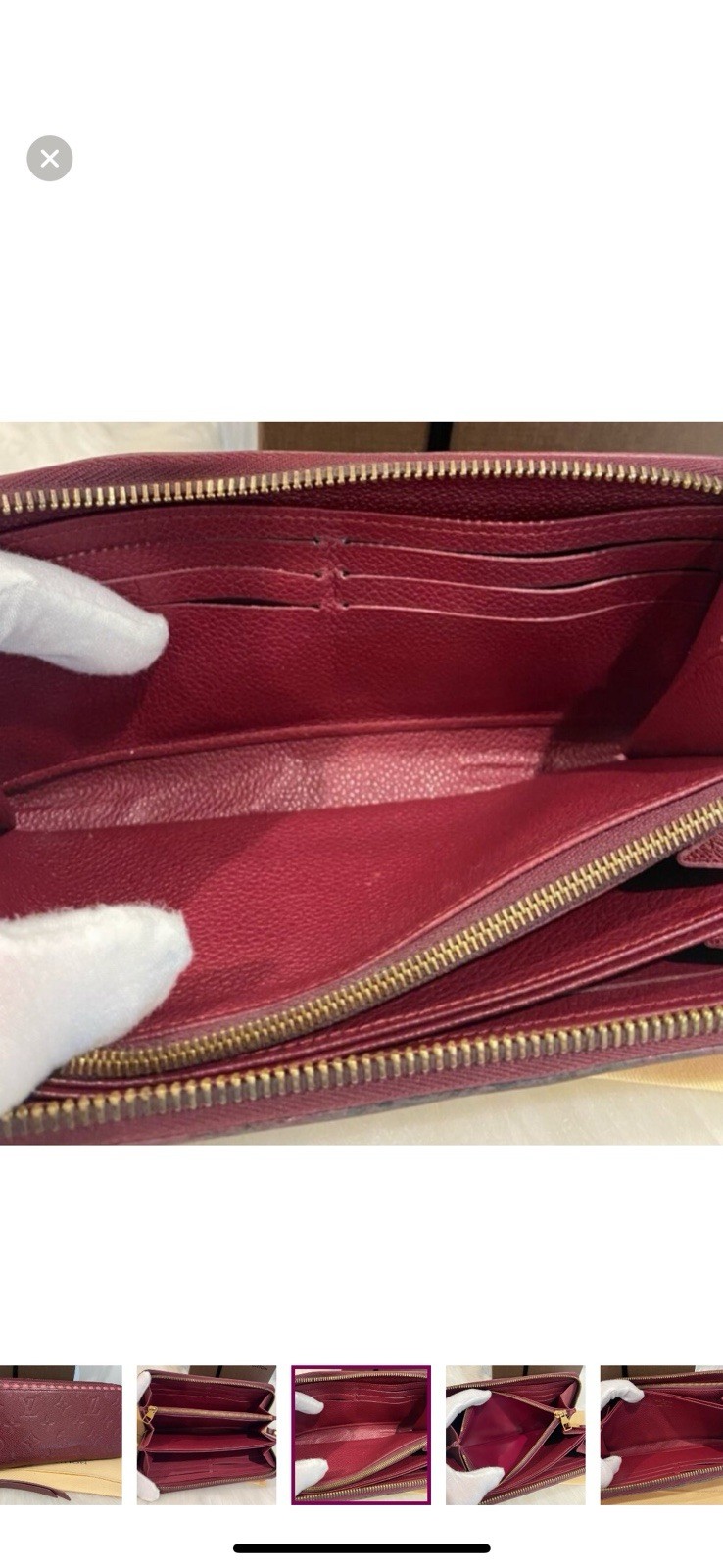 The Louis Vuitton Empreinte Wallet Zippy in Burgundy is a luxurious and stylish accessory for women. This large rectangular wallet features a zip closure and gold hardware accents, with a unique Louis Vuitton Empreinte finish. The exterior is crafted from leather with a monogram pattern, and the interior is lined with red leather. It includes a chain strap for easy carrying and multiple pockets for organization. Made in France, this wallet exudes sophistication and elegance, making it a must-have for any fashion-forward individual. This clutch/wallet is in excellent condition and looks like it’s never been used. In Falls biggest color w fun pink stitching. It would be simple to have your cordonnier/shoemaker add rings so you can wear it as a crossbody. I sell quality purse chains upon request. Auction includes beautiful LV box and dust cover.