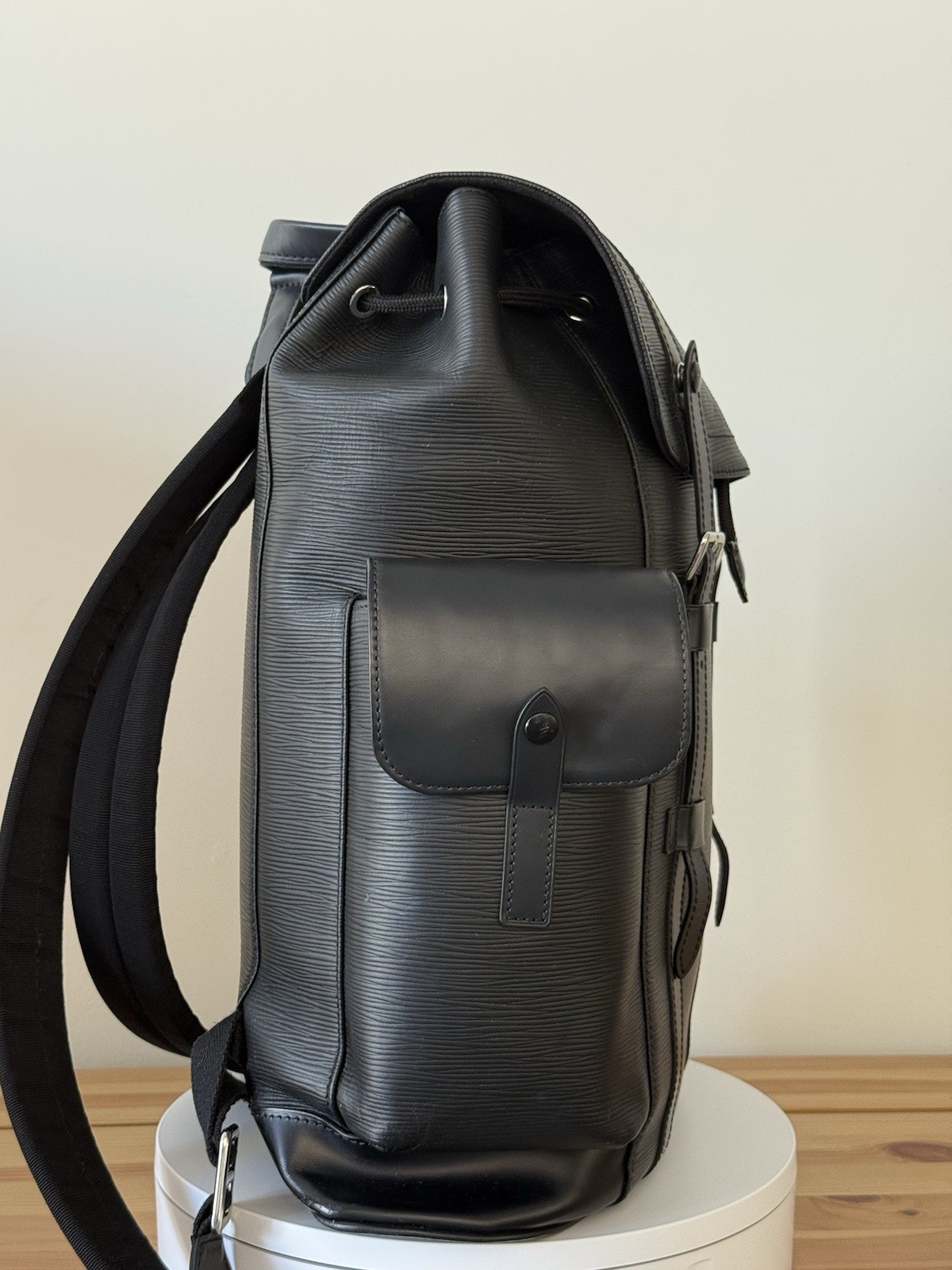 The Louis Vuitton Epi Leather Christopher PM Backpack in Black is a stylish and functional accessory for men. Made from luxurious leather with a striped pattern, this backpack features a classic drawstring closure and double handles. Perfect for travel, casual outings, or business meetings, this backpack combines sophistication with practicality. The sleek black color and metal theme make it a versatile choice for any occasion. With its iconic Louis Vuitton branding and high-quality construction, this backpack is a must-have for fashion-forward individuals. Comes with a dust bag. Outside condition: moderate wear, scratches and creases at leather. Marking. Wear at handles. Marking at hardware. Inside: moderate wear, scuffs and discoloration at suede. Marking and residue.
