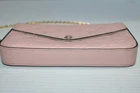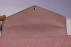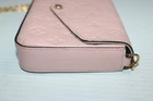 Louis Vuitton Felicie Pochette Monogram Empreinte Leather Pink Designer: Louis Vuitton Material: Pink monogram embossed calfskin leather Includes: None (inserts are missing) Date/Authenticity Code: SD2109 Measurements: 8.5" L x 1.5" W x 5" H Interior Pockets: One flat pocket Handles: Detachable chain strap Handle Drop: 22" Closure/Opening: Flap top with press stud closure Interior Lining: Pink canvas textile lining Hardware: Goldtone hang