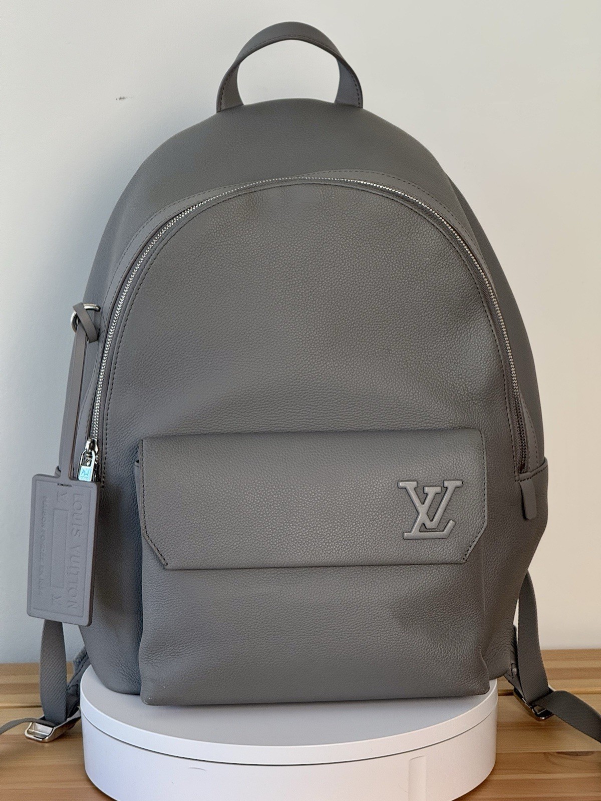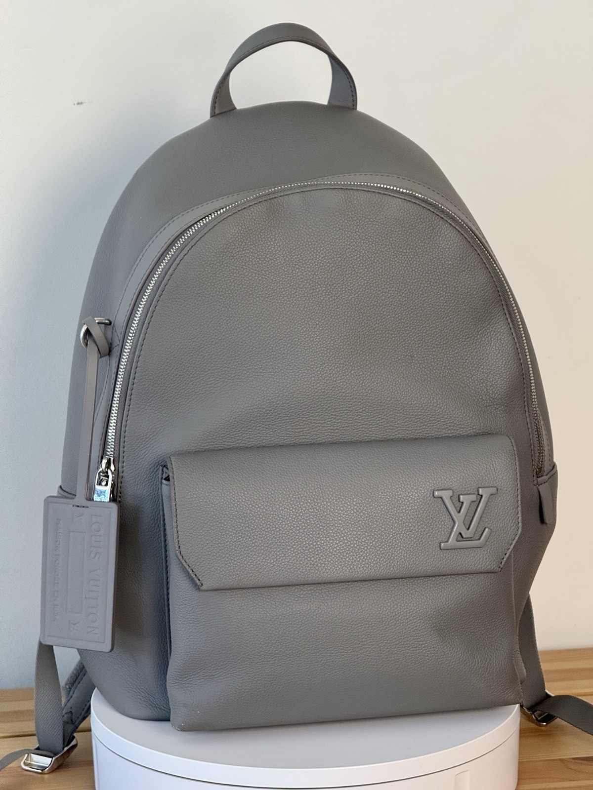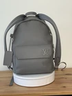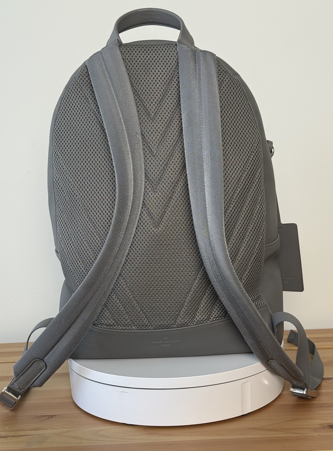 The Louis Vuitton Taurillon Leather Backpack in Gray is a stylish designer piece ideal for travel or casual occasions. Made from high-quality leather with a solid pattern, this backpack features a zip closure and double nylon handles for easy carrying. The spacious interior lined with canvas provides ample room for all your essentials. Standing at 11.5 inches in width, 16 inches in height, and 5 inches in depth, this luxury backpack exudes sophistication and practicality for the modern man on the go. Condition: outside- very good, markings at leather . Scuffs/ peeling at corners. Hardware has scratches. Inside: very good, markings, stains.