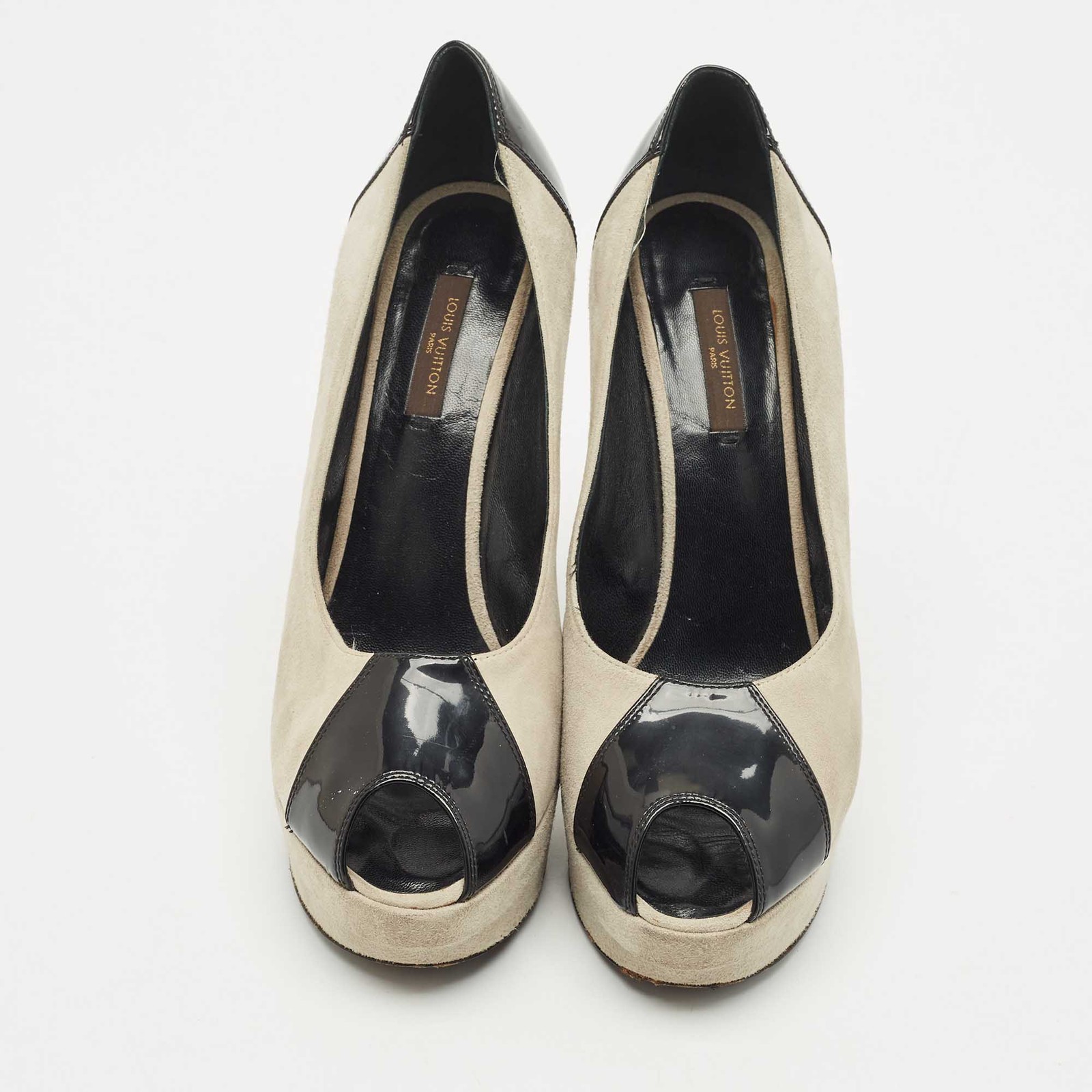 Our eBay Store About Us Contact Us Add to Favorite Sellers Louis Vuitton GreyBlack Suede And Patent Leather Peep Toe Platform Pumps Size 39 Take every step with elegance and style in these pumps from the House of Louis Vuitton. They are crafted meticulously using grey-black suede and patent leather. They showcase platforms, peep toes, and 13.5 cm heels. These pumps will be your favorite pair in no time! Product Details Brand Louis Vuitton Color Grey Includes The Luxury Closet Packaging Outsole Length 24 cm Outsole Width 7 cm Size 39 Certified by The Luxury Closet This item has gone through a detailed authentication process overseen by our experts. We offer a lifetime guarantee of authenticity on all our items. How We Check The in-house team of experts at The Luxury Closet is highly trained to verify the authenticity and the condition of the luxury products. They ensure that only 100% authentic items are put on sale.The evaluation process is unique with its own mix of assessment criteria and differs according to the category. Each item is evaluated based on the following combination of hallmarks, hardware, stitching, symmetry, material, craftsmanship, stamping, codes, hologram stickers, and packaging. Our authenticators also check if the items have been modified or amended (e.g., aftermarket diamonds, replaced batteries, repaired bags, etc.) International Buyers Import duties, taxes and charges are not included in the item price. These charges are the buyers responsibility. Please check with your country’s customs office to determine what these additional cost will be prior to buying.