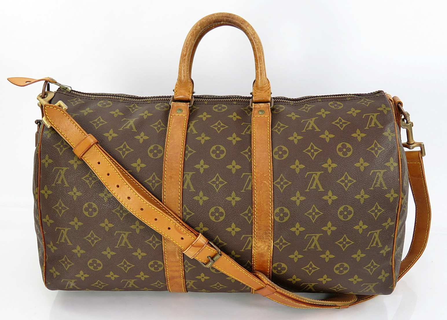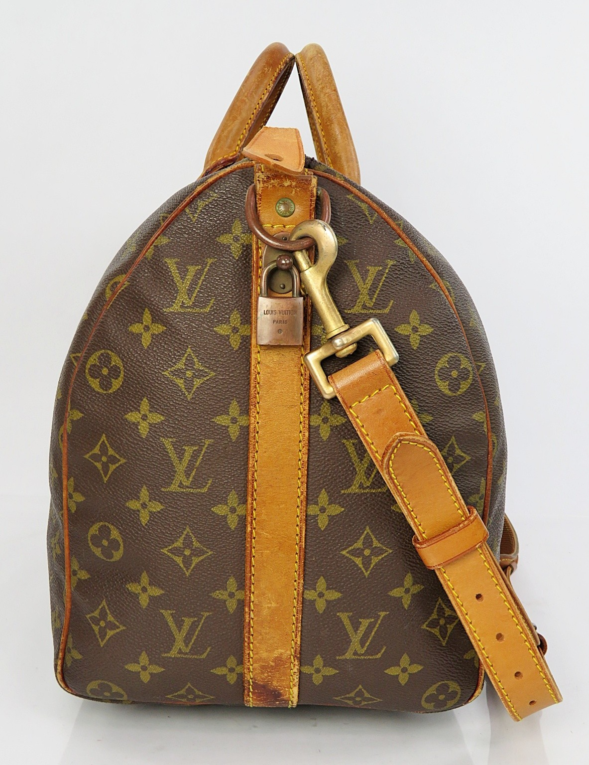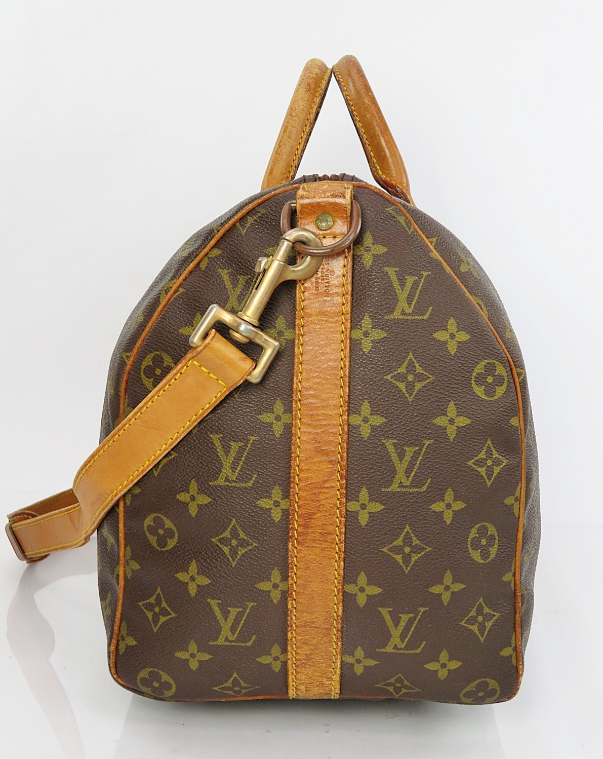 Authentic LOUIS VUITTON Keepall Bandouliere 45 Monogram Canvas Duffel Bag Item Description Description Name: LOUIS VUITTON Keepall Bandouliere 45 Made In: France Code: SD (France) Color: Browns Material: Louis Vuitton monogram canvas and leather Features: Large bag for use when you travel or go to the gym. Size in inches (approx.): W 17.7 x H 9.85 x D 7.85 Size in cm (approx.): W 45 x H 25 x D 20 Handle drop in inches: Handle : 4 Adjustable shoulder strap. Handle drop in cm: Handle : 11 Adjustable shoulder strap. Comes with: Shoulder strap and padlock (No. 205) no key. Condition Condition Rating: Outside: BC Inside: B Outside: Monogram canvas has discoloration, spots and rubbing. Leather trim has discoloration, scuffing, spots, stains, wear, wrinkles and cracks. Leather loops to attach shoulder strap and leather piping have scuffing, wear, cracks and discoloration. Inside: Discoloration, stains and spots. Outside Pockets: N/A Inside Pockets: N/A Handles: Handles have discoloration, scuffing, spots, cracks and wear. Shoulder strap has discoloration, spots, stains, scuffing, wear and wrinkles. Corners: Scuffing, burnt, cracks and discoloration of leather piping. Scuffing of canvas. Snaps, Zippers and Hardware: Zipper works fine. Leather tab on zipper pull has cracks and wear. Hardware has scratching, tarnish, peeling and discoloration. Odor: Storage smell. Please see pictures for more details. Payment and Shipping Information Payment Options: We accept all eBay approved payment methods. Shipping: Shipping is FREE worldwide. All products are sent by EMS (Express Mail Service) or DHL and you will get a tracking number. Sales Tax: Any customs fees, duties and taxes are the responsibility of the buyer. Please contact your country's customs office to find out these costs before bidding or buying. Customer Service & Return Policy: We accept all returns within 30 days of receiving the merchandise. We will refund original payment when the product has returned and is found in the same condition as it was sold, unless otherwise agreed upon. We do NOT refund original shipping charge. Return shipping costs are the responsibility of the buyer. About Us: We have been in the business of selling pre-owned, 100% authentic brand name products for over 20 years. We manage brick and mortar shops in Tokyo, Japan, selling items on consignment. Each item is checked for authenticity by a trained professional. All items were previously owned by Japanese who are famous for taking extra good care of these excellent and beautiful fashion goods. We are a licensed dealer with the Japanese Police Department. Authorization number: 431330028017. Please check the condition and photos carefully before bidding. If you are not completely satisfied with your purchase, Please contact us with any problems or concerns before leaving neutral or negative feedback. We will do our best to make you feel satisfied. Please email me with any questions. Good luck and thanks for looking. Powered by SixBit's eCommerce Solution