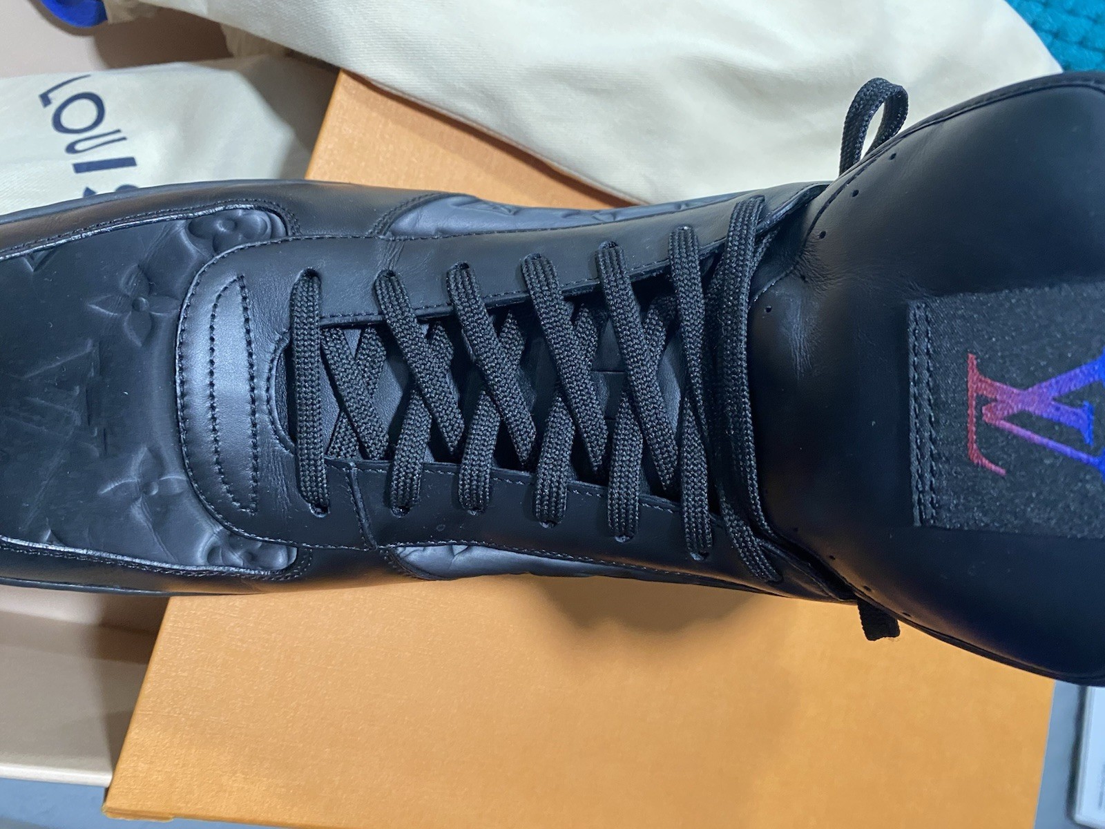 These Louis Vuitton Men's Size 13 Shoes are a stylish and luxurious choice for casual occasions. Only wore once for less than 8 hours in perfect condition with box. Crafted in Italy with high-quality leather, these lace-up sneakers feature a solid black color with the iconic Louis Vuitton logo details.