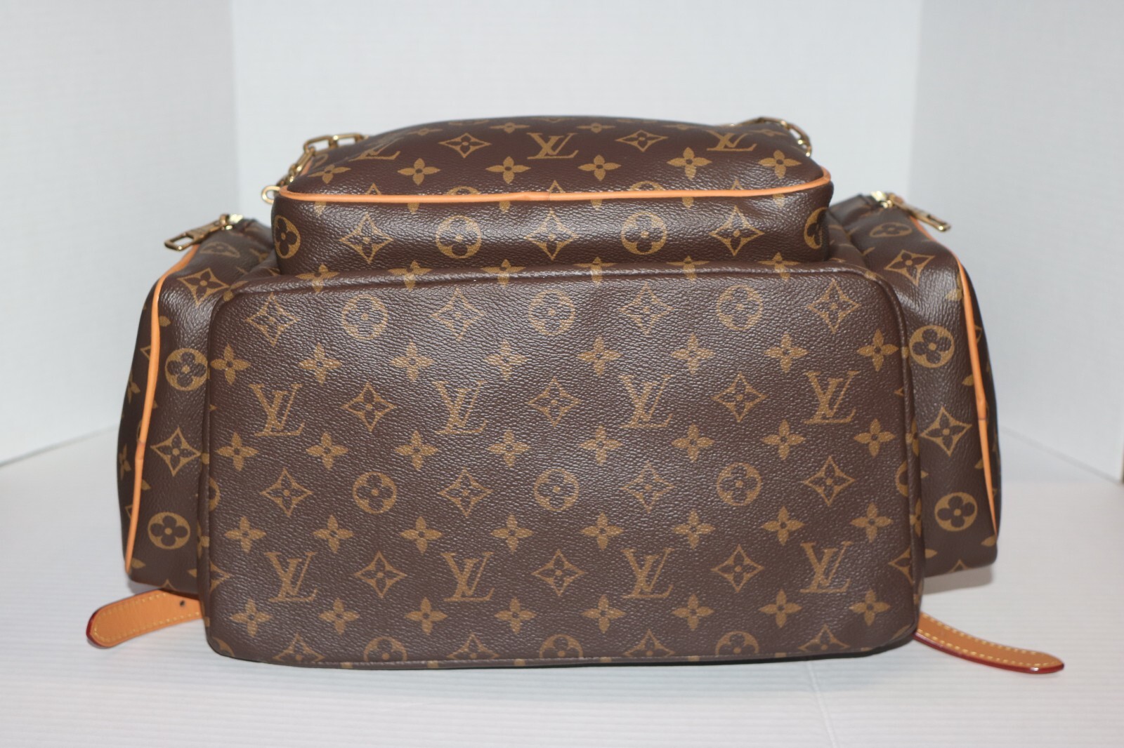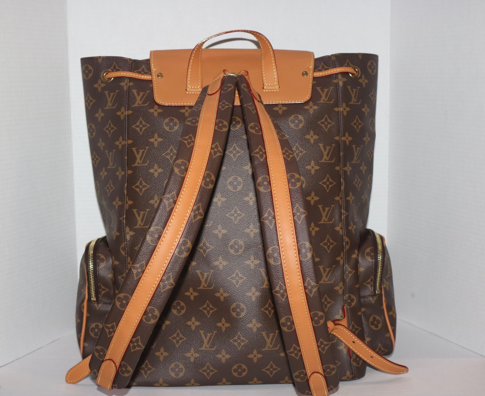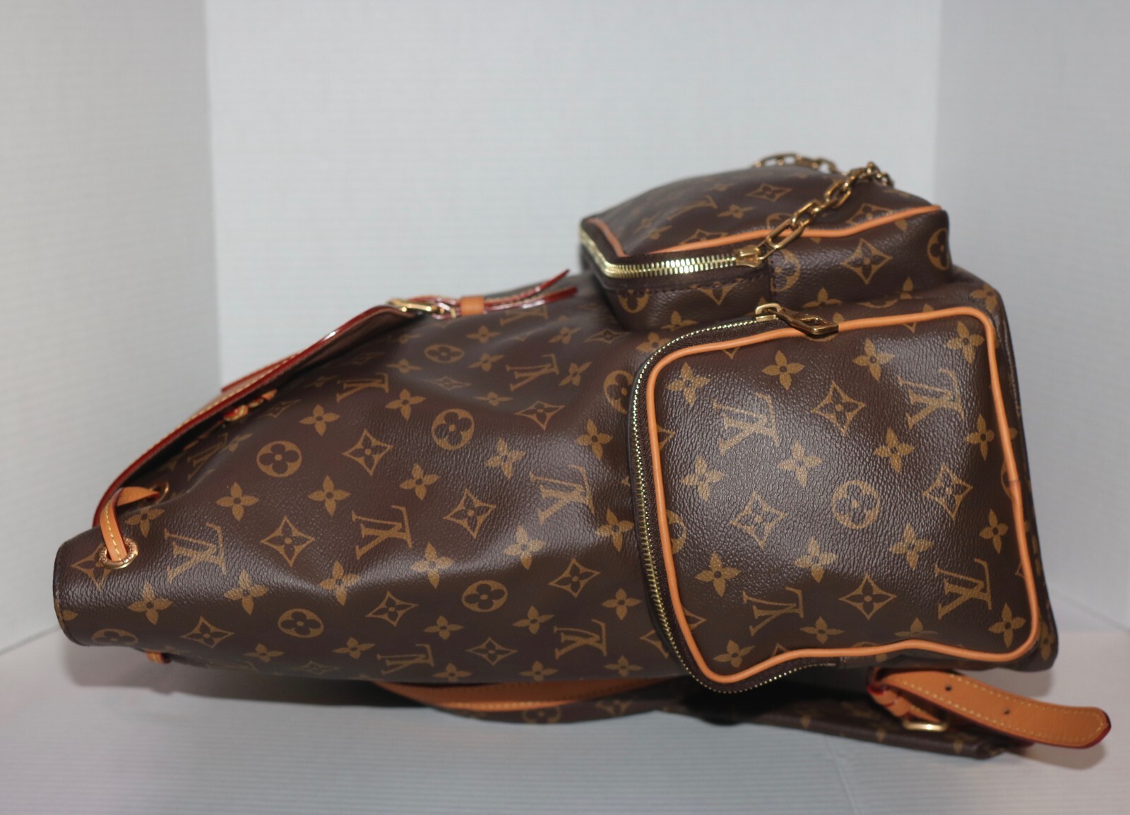 Louis Vuitton Brown Monogram Canvas Trio Backpack Bag M44658 Designer: Louis Vuitton Material: Monogram coated canvas with leather trim Includes: Dust bag Origin: Spain Production Year: 2019 Date/Authenticity Code: N/A (RFID chip has been scanned) Measurements: 23.3" L x 7.5" W x 29" H Interior Pockets: Three flat pockets Exterior Pockets: Three exterior zip pockets Handles: Backpack straps Closure/Opening: Flap top with magnetic snap and cinch closure Interior Lining: Fine textile lining Hardware: Goldtone