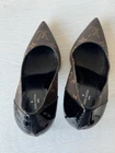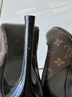 The Louis Vuitton Monogram Canvas and Patent Leather Cherie Pumps in size LV37 are luxurious and stylish heels designed for women. With a pointed toe shape and brown color, these pumps feature a combination of canvas lining and leather upper material. The iconic Louis Vuitton logo adds a touch of elegance to the design, making them a chic and fashionable footwear choice for any outfit. Perfect for the woman who values high-quality craftsmanship and timeless style. Condition: very good. Scratches at heel, scratches and scuffs at soles.