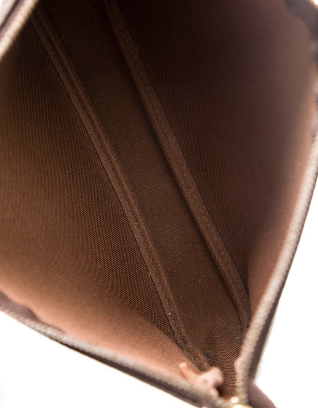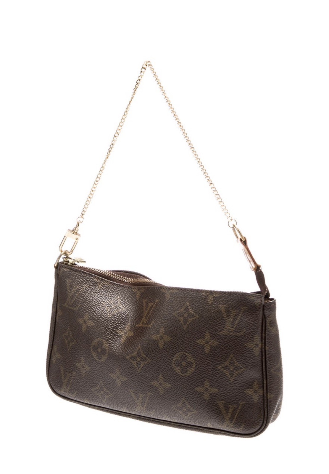 • Louis Vuitton Top Handle Bag • From the 2002 Collection • Vintage • Brown Coated Canvas • LV Monogram • Brass Hardware • Chain-Link Handle • Chain-Link Accents • Canvas Lining • Zip Closure at Top Height: 5.5" Width: 9.75" Depth: 1.25" Gender: Women Color: Brown Condition: Very Good. Minor discoloration at exterior and at interior; minor oxidation at hardware. Slightly Fringed at D ring. Chain was replaced by a third party company (not an LV chain) bag itself is authentic.
