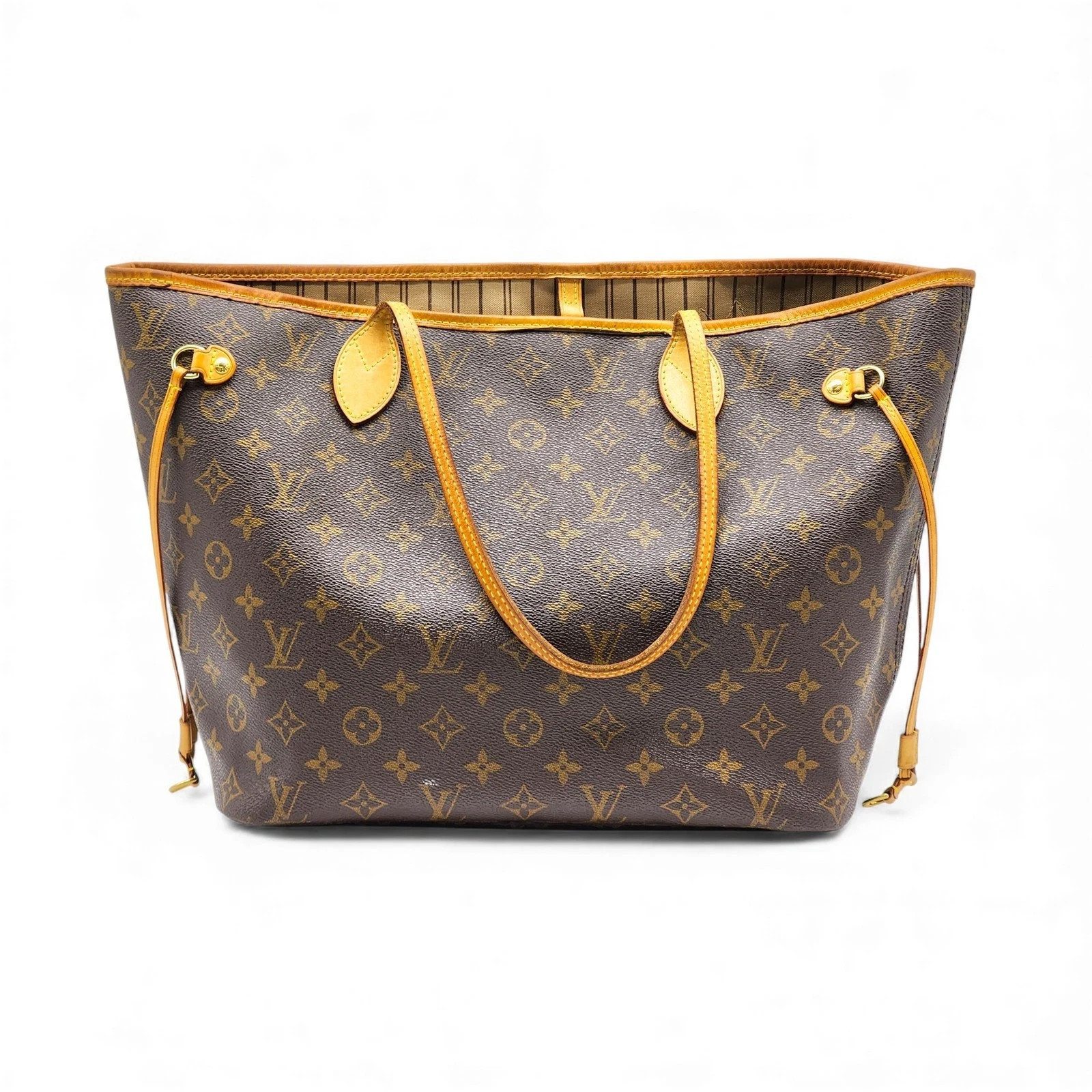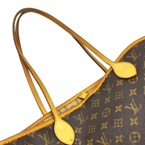 Bought and was Authenticated Through Ebay-bought a smaller one that fit me better so I'm selling this one. This classic Louis Vuitton Neverfull MM combines iconic Monogram canvas with natural Vachetta leather trim and slim shoulder straps. Spacious, lightweight, and durable, it’s designed for everyday carry with an open top, side cinch cords, and a striped textile interior. A timeless LV essential with signature elegance. Pictures show use, wear and stains. MM Size: 12.2 x 11 x 5.5 inches Features • Monogram coated canvas with Vachetta leather trim and handles • Beige striped textile lining • Open top with clasp closure • Interior zip pocket and roomy main compartment • Handle drop approx. 8.5" • Made in Spain • Condition shown in photos (marks inside) - exterior in great condition • Side drawstring cinch details • Gold-tone hardware • Shoulder carry