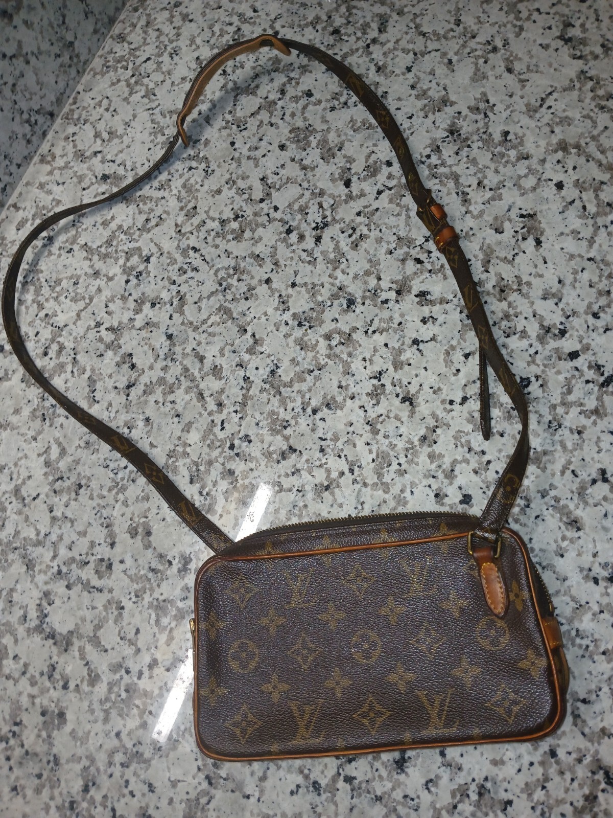This Louis Vuitton Pochette Twin GM is a stylish and practical crossbody bag with a classic monogram design. Despite some scuffs and minor wear on the leather, it remains in good used condition with a functional strap and plenty of space inside. Perfect for everyday use while keeping that luxury appeal!