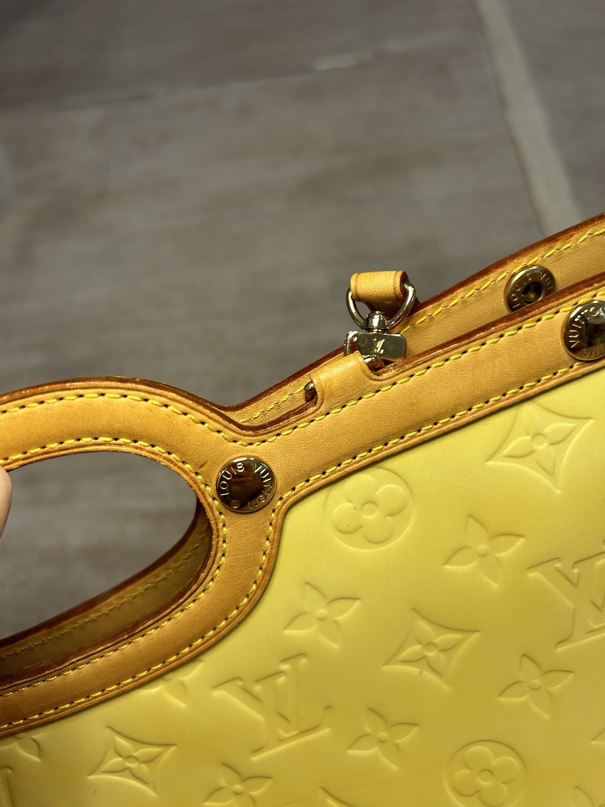 Absolutely gorgeous pre-loved Louis Vuitton Roxbury Drive handbag! Comes with convertible shoulder strap. Amazing condition (aside from one minor scuff on back, as pictured). Don’t miss out on a chance to add this Vernis Yellow stunner to your collection! Purchase comes with Certificate of Authenticity powered by Real Authentication