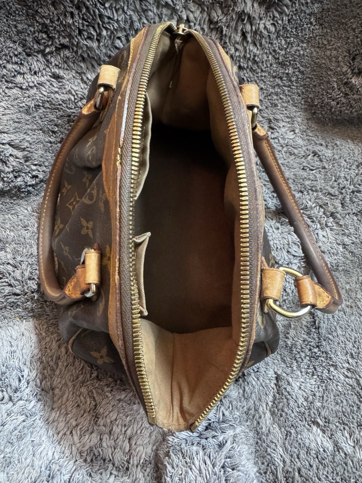 The Louis Vuitton Tivoli Tote GM in Brown Canvas Monogram is a stylish and luxurious handbag designed for women. With a classic monogram pattern and gold hardware accents, this tote features a brown leather handle/strap and a zip closure. The coated canvas exterior is combined with a microfiber lining, making it a durable and versatile accessory for everyday use. The spacious size and comfortable strap drop make it a practical and chic choice for any outfit, showcasing the iconic Louis Vuitton Tivoli product line.
