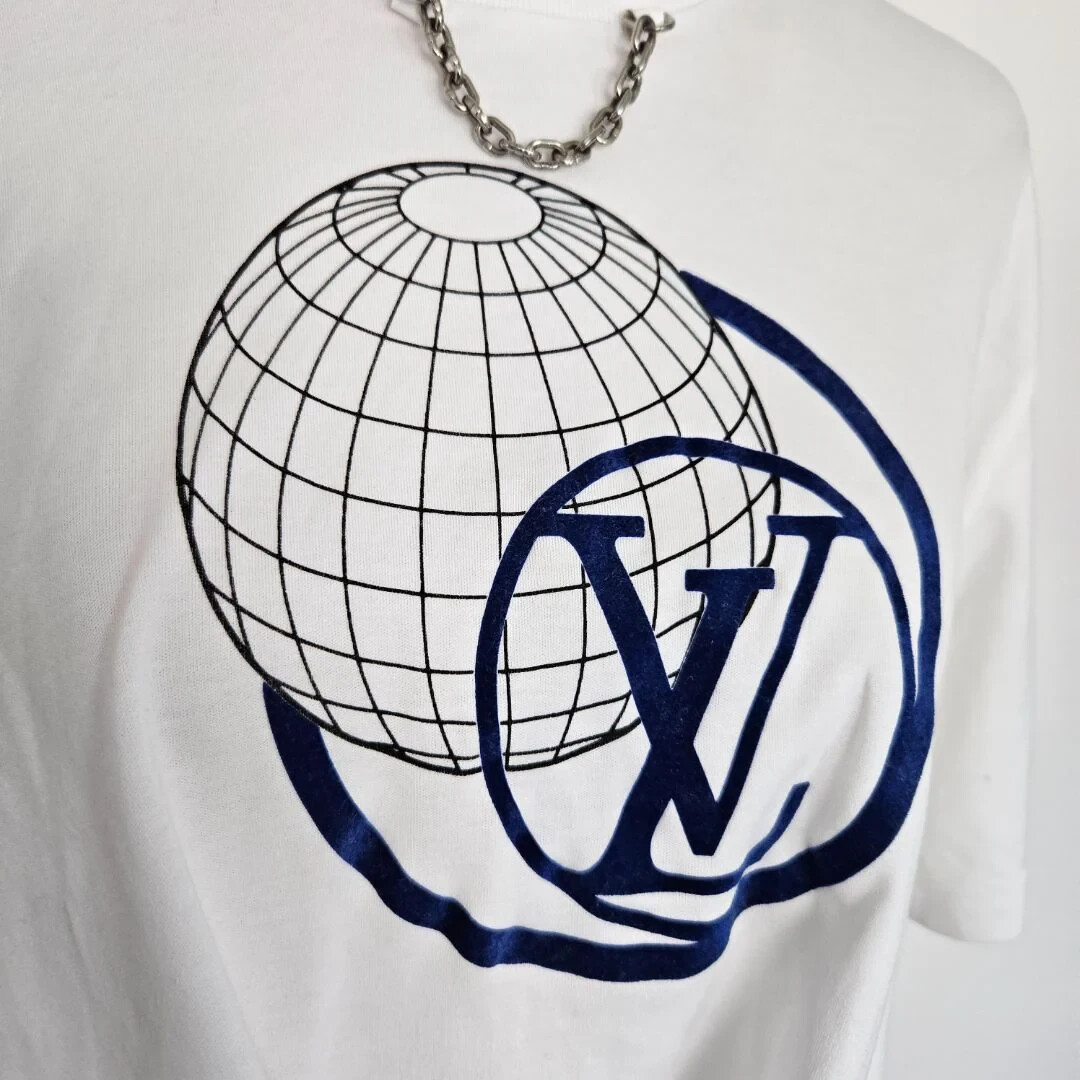 Louis Vuitton White LV Globe Self Tie T Shirt Attributes Material: Cotton 86%, Polyester 14% Color: White Condition: Excellent Size: Large
