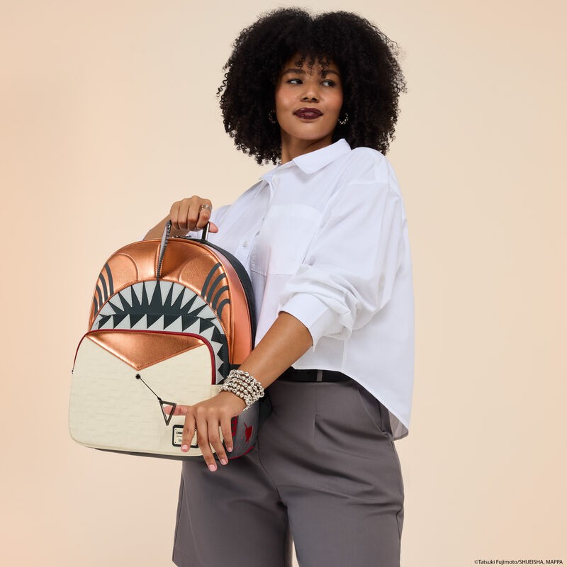 This bag features Denji in Chainsaw Man form, complete with 3D silver foil "chainsaw" sticking out from the front, embroidered chainsaw on the side, and "blood splatter" details. It's the perfect accessory to show off one of your favorite animes! Features Full-size faux leather (polyurethane) backpack Metal top handle Adjustable shoulder straps Retractable molded metal charm Silver foil, applique, debossed, embroidered, metallic faux leather, patent faux leather, and printed details Coordinating interior lining Dimensions: 12"W x 17"H x 5"D 30.4cm W x 43cm H x 12.7cm D This is an officially licensed Chainsaw Man product.