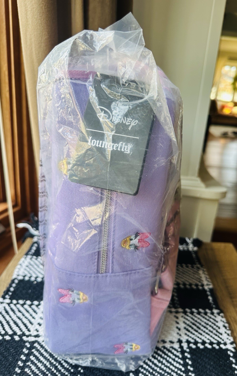 Loungefly Disney Daisy Duck Allover Print Mini Backpack NWT In original packaging! Rare and sought after in this condition! Add some feathery flair to your look with this mini backpack! Featuring embroidered designs of Daisy Duck across the front, this bag includes top handles and adjustable straps, perfect for your next Disney Parks trip. Canvas Approx. 10" W x 12" H x 5 1/2" D Imported
