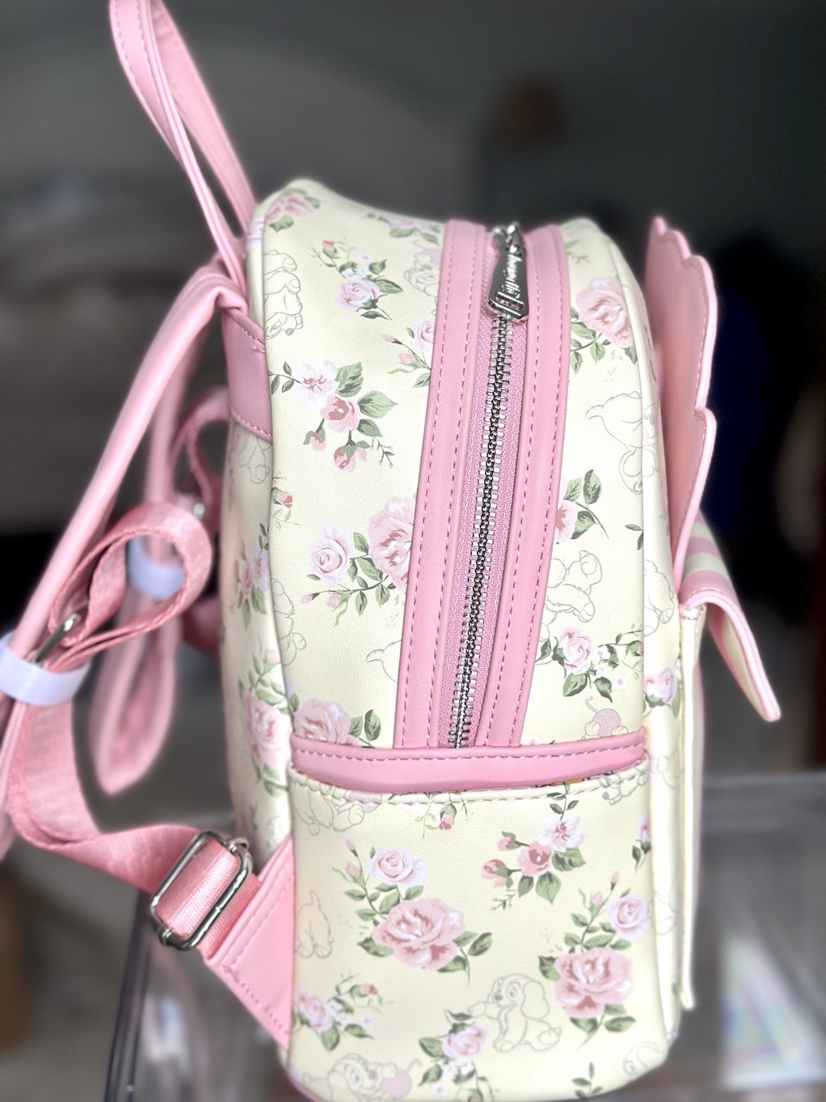 Loungefly Disney Lady and the Tramp Hat Box Mini Backpack - Rare sold out BoxLunch Exclusive Bag is preloved in excellent condition and cardholder is NWT Welcome Lady to the family with this adorable Lady and the Tramp mini backpack from Loungefly! Capturing Jim Dear’s puppy in a hat box gift, Lady appears as the movable die-cut applique on the front, peeking out from the hat box-inspired front pocket. With a delicate allover floral print, this mini backpack also features silver-toned hardware, top handle, adjustable shoulder straps, enamel brand badge, and a floral allover print interior lining featuring Lady in playful poses. A BoxLunch Exclusive! Polyurethane Approx. 9” W x 10 1/2” H x 4 1/2” D Imported