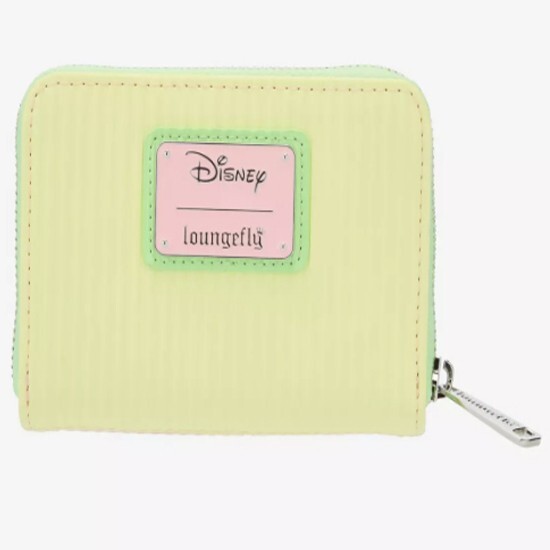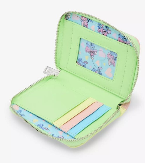 Officially Licensed Loungefly Disney merchandise Features a chenille applique of Stitch and Angel on the front Body: Color blocked with a textured body 4 card slots and a clear ID sleeve Polyurethane Measures 5" W x 4" H