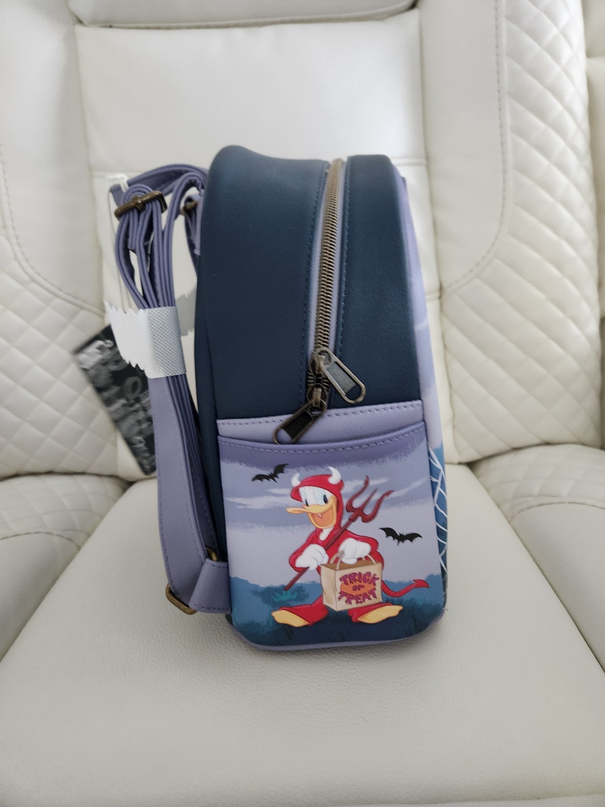 Wallet: Get into the spooky spirit with Mickey Mouse and his besties! This mini wallet shows Mickey Mouse, Minnie Mouse, Pluto, Daisy Duck and Donald Duck dressed in Halloween costumes, plus Chip 'n' Dale with candy corn. Comes with 4 card slots, clear ID slot and zipper closure. 5" x 4" Polyurethane 4 card slots Clear ID slot Backpack: Get into the spooky spirit with Mickey Mouse and his besties! This mini backpack shows Mickey Mouse and Minnie Mouse dressed as mummies under a crescent moon with bats overhead. Pluto has a pirate fit on, and Chip n' Dale appear in the foreground with candy corn. The side pockets show Donald Duck as a devil, and Daisy Duck as a witch. Interior pocket and adjustable straps. 9 1/2" x 4 1/2" x 10 1/2" Polyurethane Side pockets