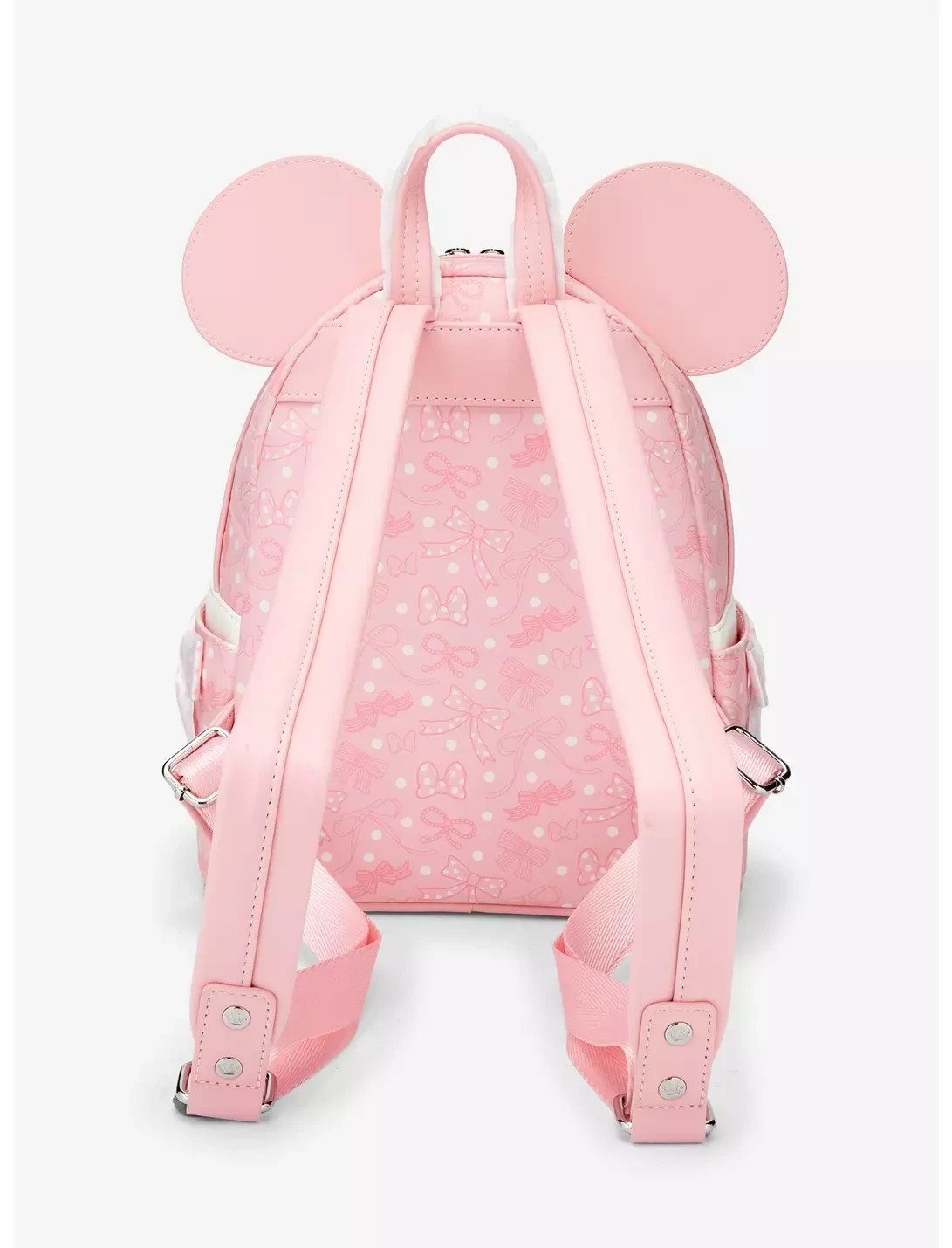 The Loungefly Disney Minnie Mouse Debossed Bows Mini Backpack is a stylish and compact accessory for women featuring iconic Minnie Mouse character design. Made of durable polyurethane material in a vibrant pink color, this mini backpack is adorned with charming bow accents that add a touch of elegance to any outfit. Perfect for carrying essentials while showcasing a fun and feminine flair, this backpack is a must-have for any Disney fan or fashion-forward individual.