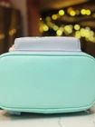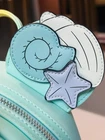 The backpack shown is the Loungefly Disney Minnie Mouse Mermaid Ombre Mini Backpack. This official Disney product features a pastel ombré design, 3D Minnie Mouse ears with sea shell appliques, and a bow. NWT