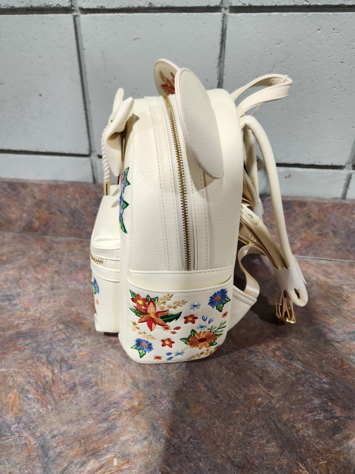 Add a floral finish to your looks with this mini backpack! Featuring embroidered orange and blue flowers, the front of this bag also includes figural Minnie Mouse ears and a bow with rope details. With side pockets and adjustable straps, this accessory is perfect for a trip to the Disney Parks. Polyurethane Approx. 9" W x 10 3/4" H x 5" D