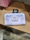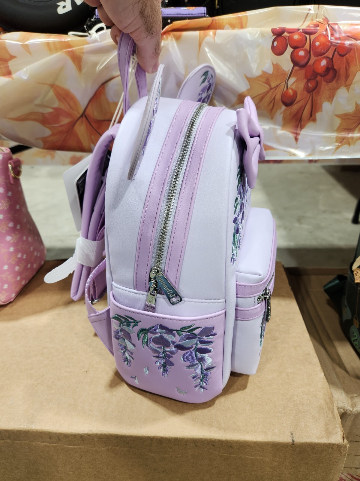Wallet: Add a floral finish to your outfits with this Loungefly wallet! Featuring embroidered wisteria flowers, the front also includes applique Minnie Mouse ears and a bow. With seven card slots, a clear ID sleeve, a bills compartment, and a zippered side pouch, this wallet is floral scented to complete the look. Polyurethane Approx. 6 1/2" W x 4" H Backpack: Add a floral finish to your outfits with this Loungefly mini backpack! Featuring embroidered wisteria flowers, the front also includes applique Minnie Mouse ears and a bow. With more flowers on the side pockets, this backpack is floral scented to complete the look. Polyurethane Approx. 9" W x 10 3/4" H x 5" D Floral scent