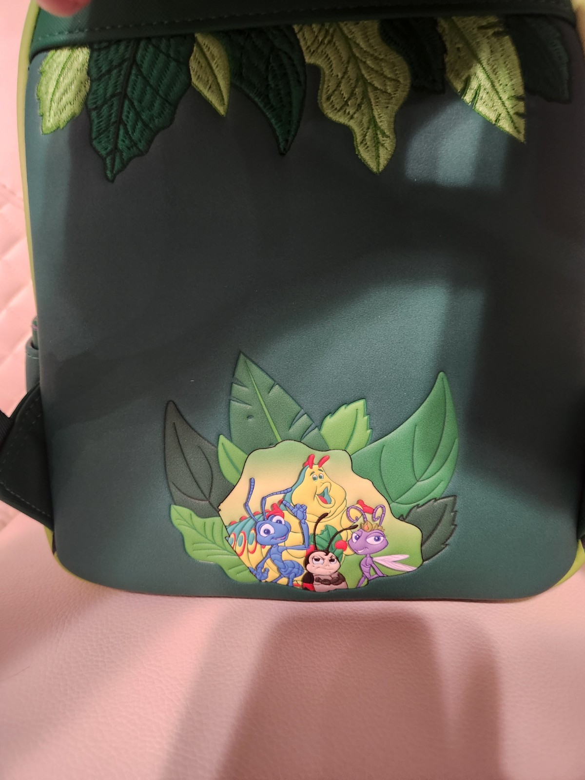 Add some insect flair to your look with this Bug's Life mini backpack! Featuring appliques of Flik, Atta, Francis, and Heimlich among embroidered leaves and flowers on the front, the back includes portraits of them printed. With adjustable straps and two zippered pockets, this bag is made for adventures. Polyurethane Approx. 9" W x 10 3/4" H x 5" D